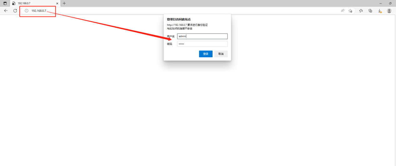 2、在電腦瀏覽器中輸入設(shè)備默認(rèn)IP:192.168.0.7,即可打開(kāi)設(shè)備內(nèi)置網(wǎng)頁(yè)修改參數(shù),默認(rèn)用戶(hù)名密碼均為admin