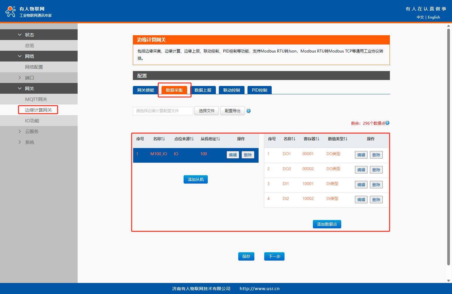 數(shù)據(jù)采集中填入U(xiǎn)SR-M100自身的內(nèi)置IO從機(jī)和點(diǎn)位保存,下一步。