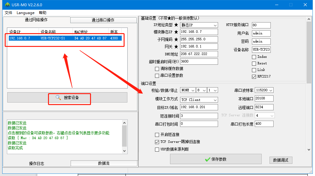 用M0設(shè)置軟件搜索設(shè)備,獲取S1 的IP參數(shù),點(diǎn)擊S1的IP,將S1的IP設(shè)置192.168.0.8,工作方式TCP client,本地端口 0,遠(yuǎn)程端口23,目標(biāo)IP 192.168.0.7,點(diǎn)擊保存參數(shù)