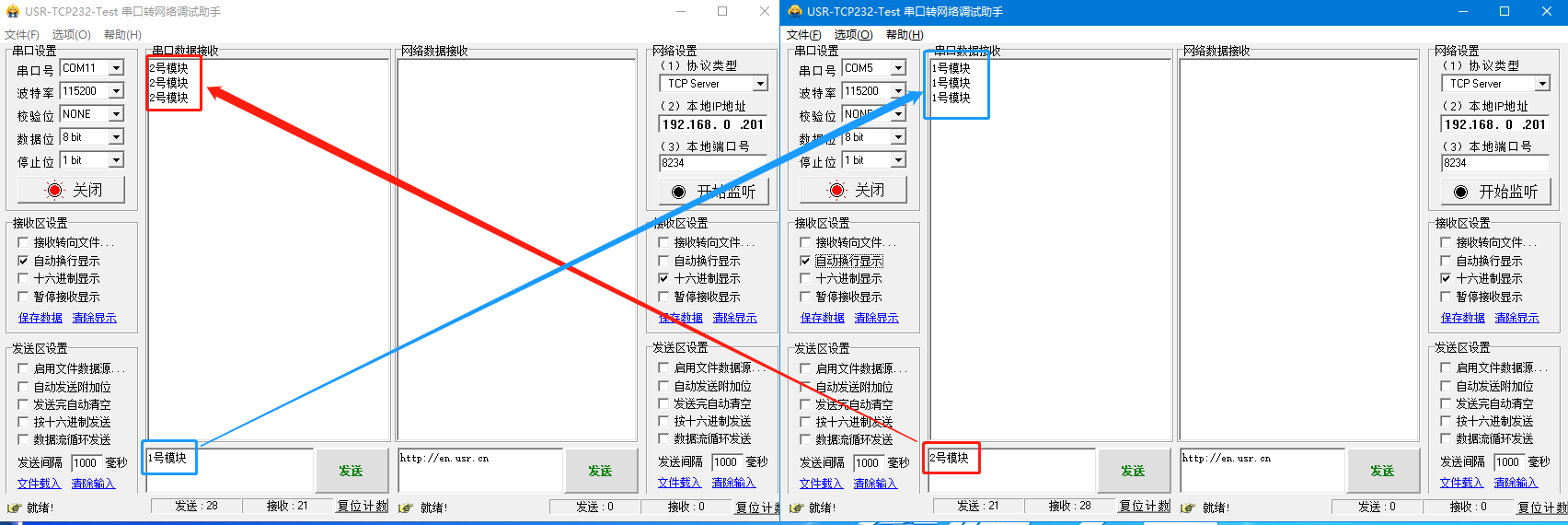 電腦用串口助手打開2個(gè)S1的COM口,用對(duì)應(yīng)S1的串口參數(shù),然后進(jìn)行數(shù)據(jù)傳輸。