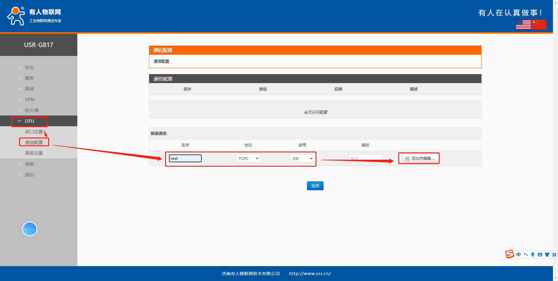 新建通道:設(shè)置名稱--協(xié)議選擇(TCP client)--啟用(ON)--添加并編輯