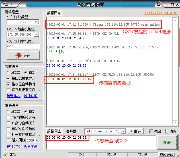 服務(wù)器端下發(fā)查詢指令查詢數(shù)據(jù),可以收到傳感器的響應(yīng),說明通訊正常