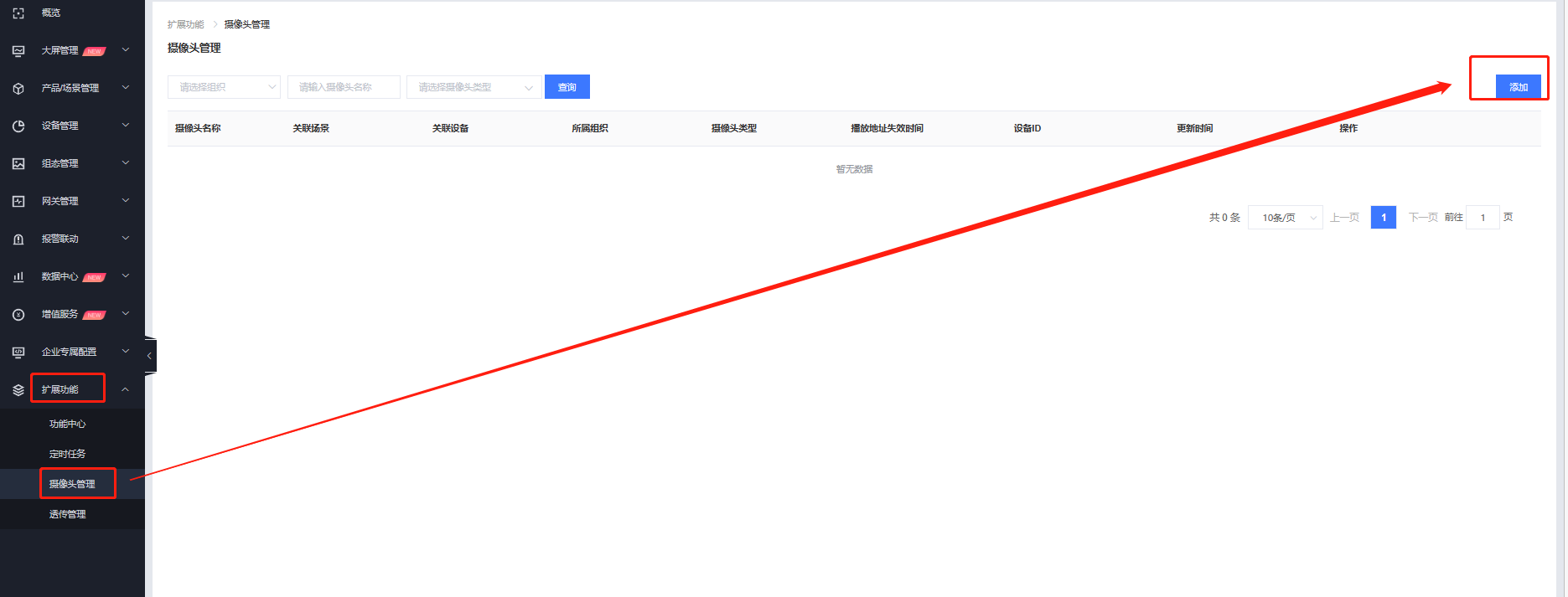 9.登錄有人左側(cè)導(dǎo)航欄擴(kuò)展功能—攝像頭管理—添加