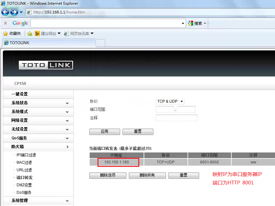4:進(jìn)入路由器進(jìn)制端口轉(zhuǎn)發(fā)端口映射,將串口服務(wù)器的IP地址和HTTP端口(8001)映射。