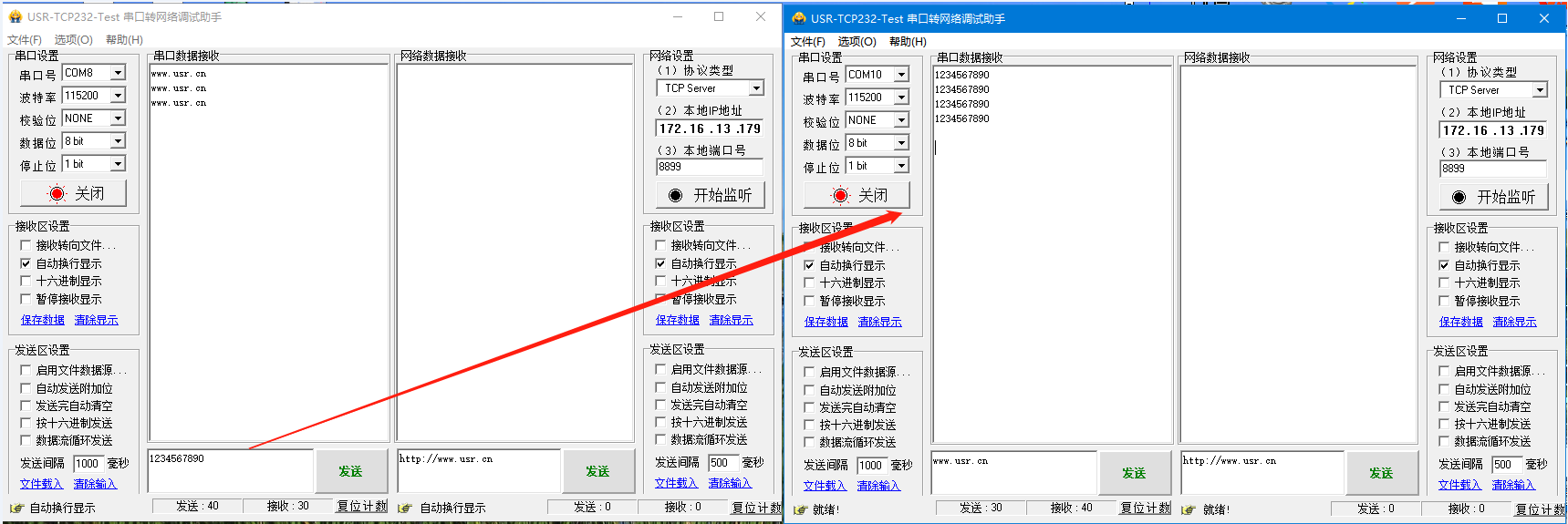 打開(kāi)2個(gè)串口調(diào)試助手,分別打開(kāi)發(fā)送端的com8 115200 N 8 1) 和接收端的com10(115200 N 8 1),互相發(fā)送數(shù)據(jù)。