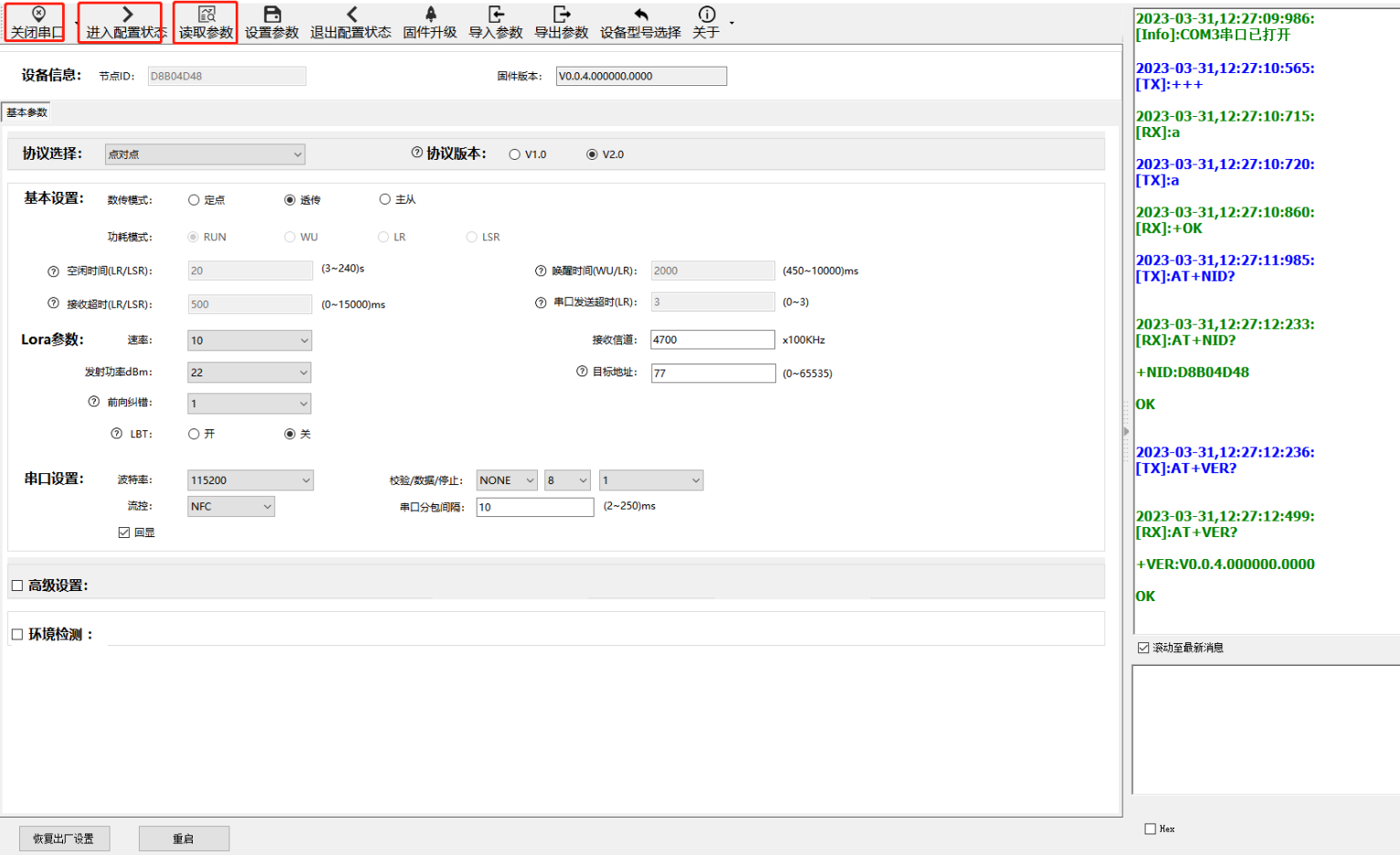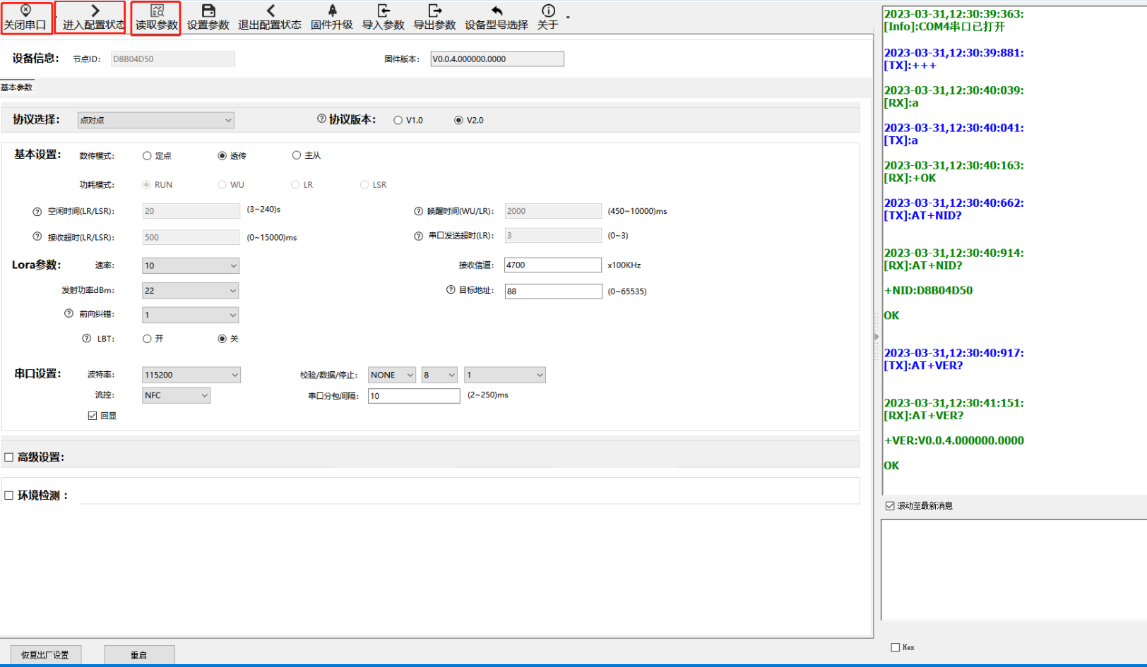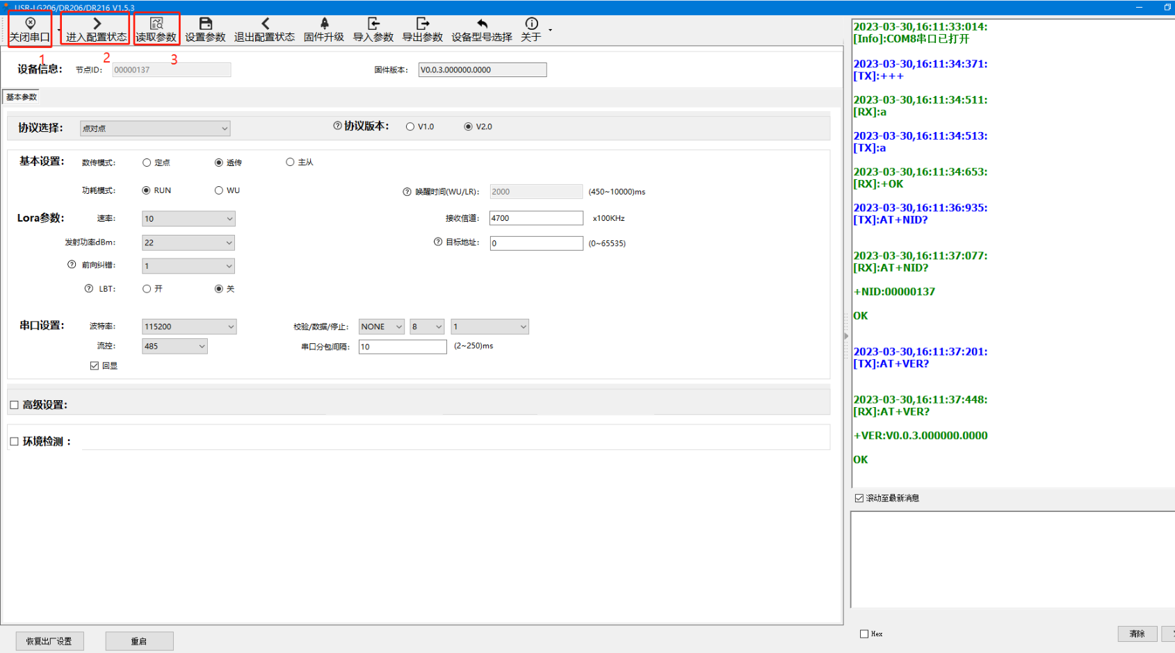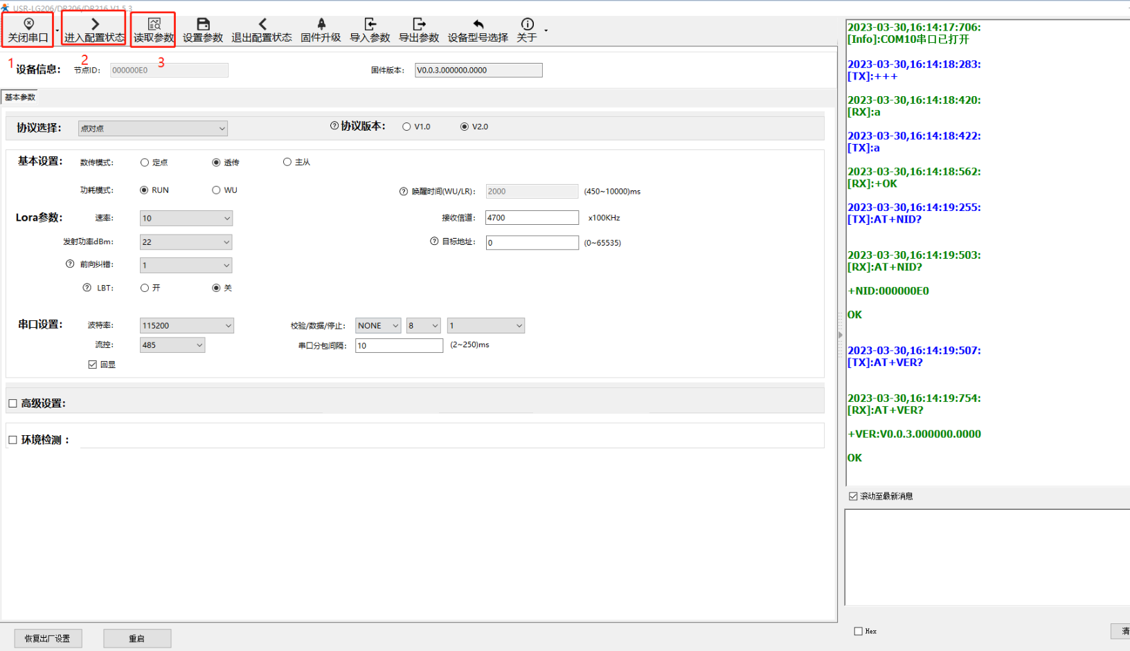 2)按照順序點(diǎn)擊“打開(kāi)串口”---“進(jìn)入配置狀態(tài)”---“讀取參數(shù)”