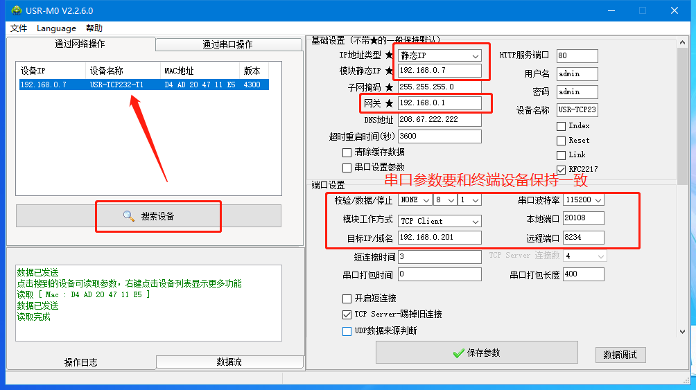 4、點(diǎn)擊“搜索設(shè)備”當(dāng)搜索列表中出現(xiàn)T1的設(shè)備后,單擊搜索到的設(shè)備,查看其配置信息(上圖為默認(rèn)配置信息)。