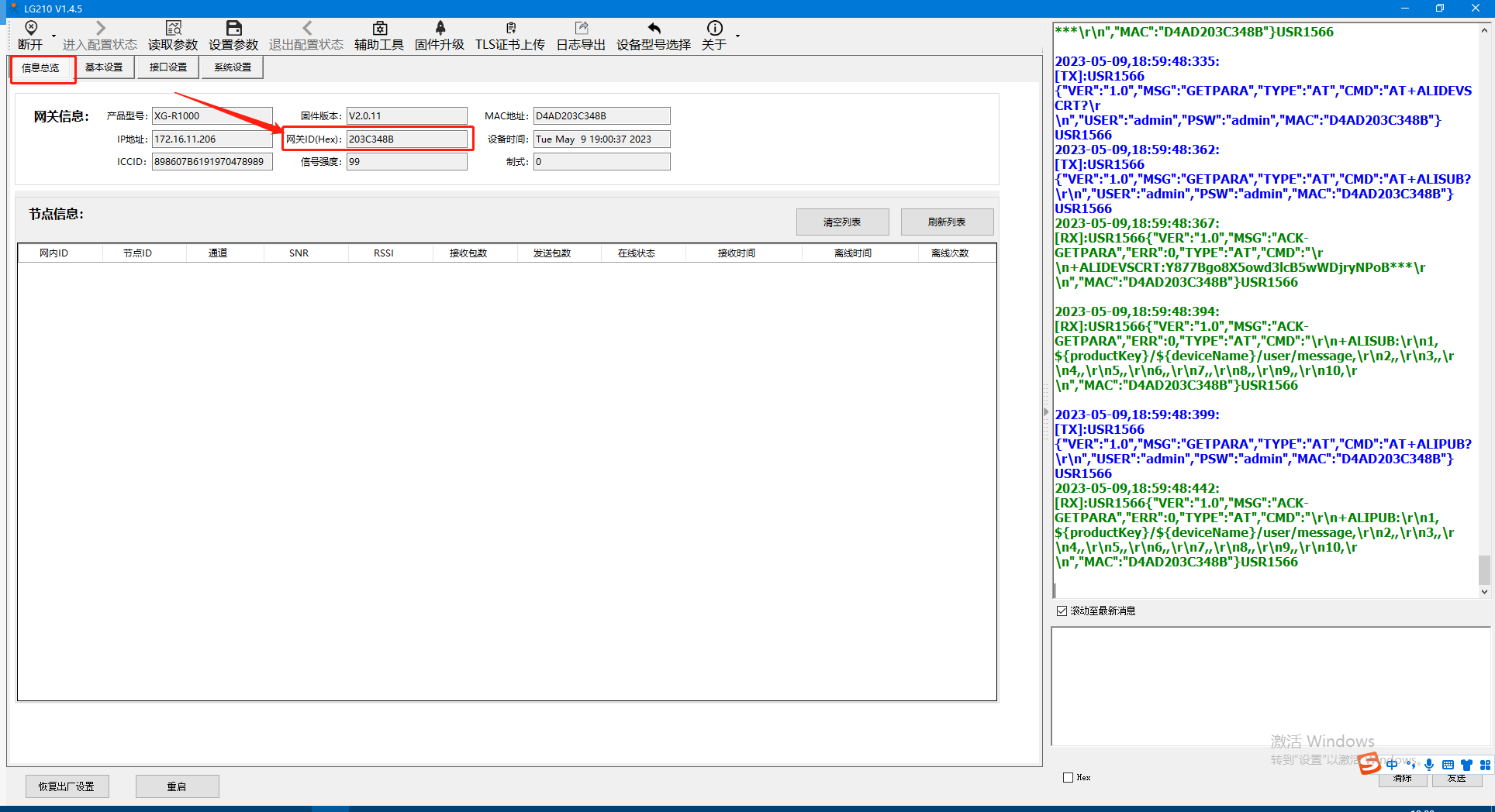 8、LG210重新獲取參數(shù),在節(jié)點(diǎn)信息中可以看到添加的USR-DR206-L已組網(wǎng)成功。