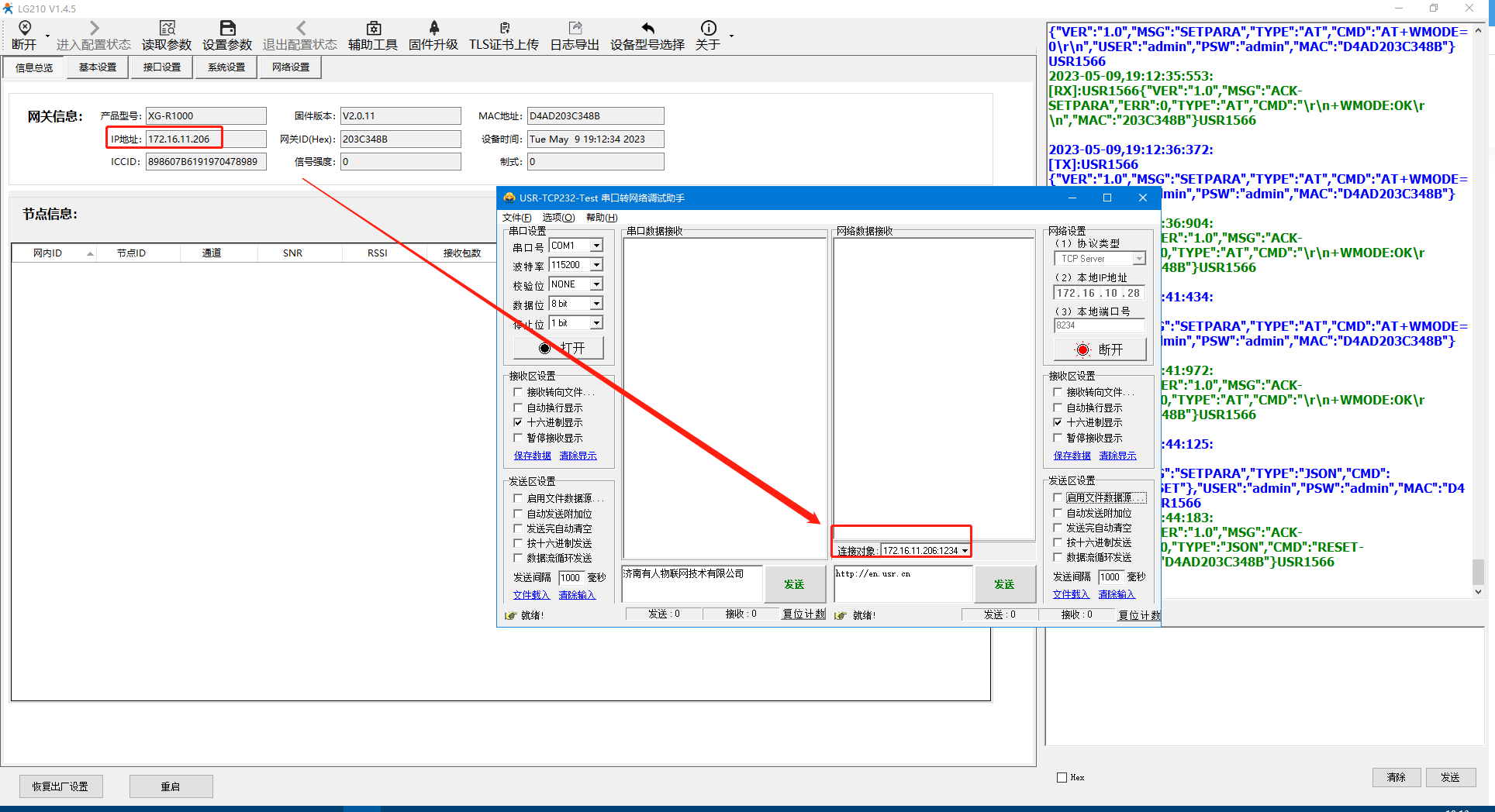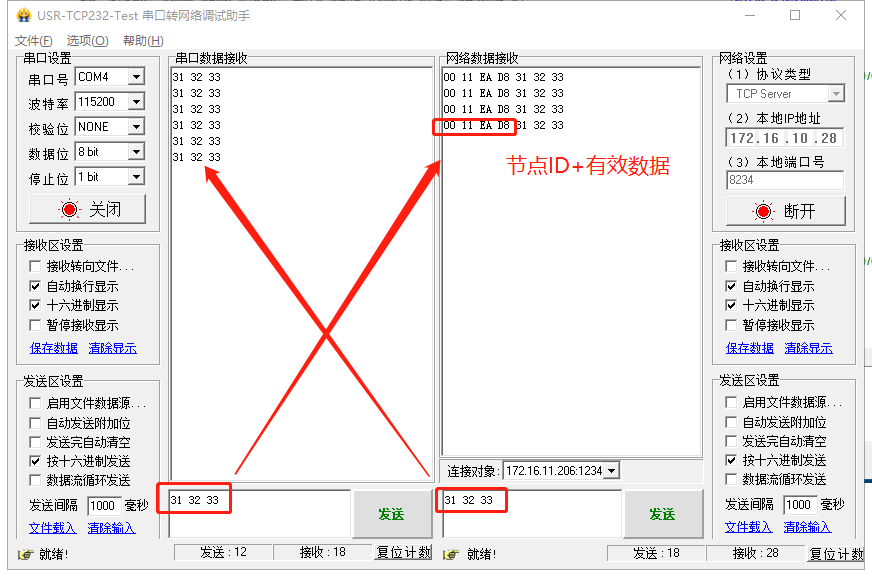 電腦打開一個(gè)串口轉(zhuǎn)網(wǎng)絡(luò)調(diào)試助手,打開對(duì)應(yīng)USR-DR206-L串口線COM口號(hào),USR-LG210網(wǎng)絡(luò)端發(fā)送有效16進(jìn)制的數(shù)據(jù),有效數(shù)據(jù)透?jìng)鹘oDR206串口。DR206串口發(fā)送 HEX數(shù)據(jù),數(shù)據(jù)傳輸給LG210網(wǎng)絡(luò)端,接收數(shù)據(jù)顯示(數(shù)據(jù)格式為:16進(jìn)制節(jié)點(diǎn)ID+有效數(shù)據(jù))