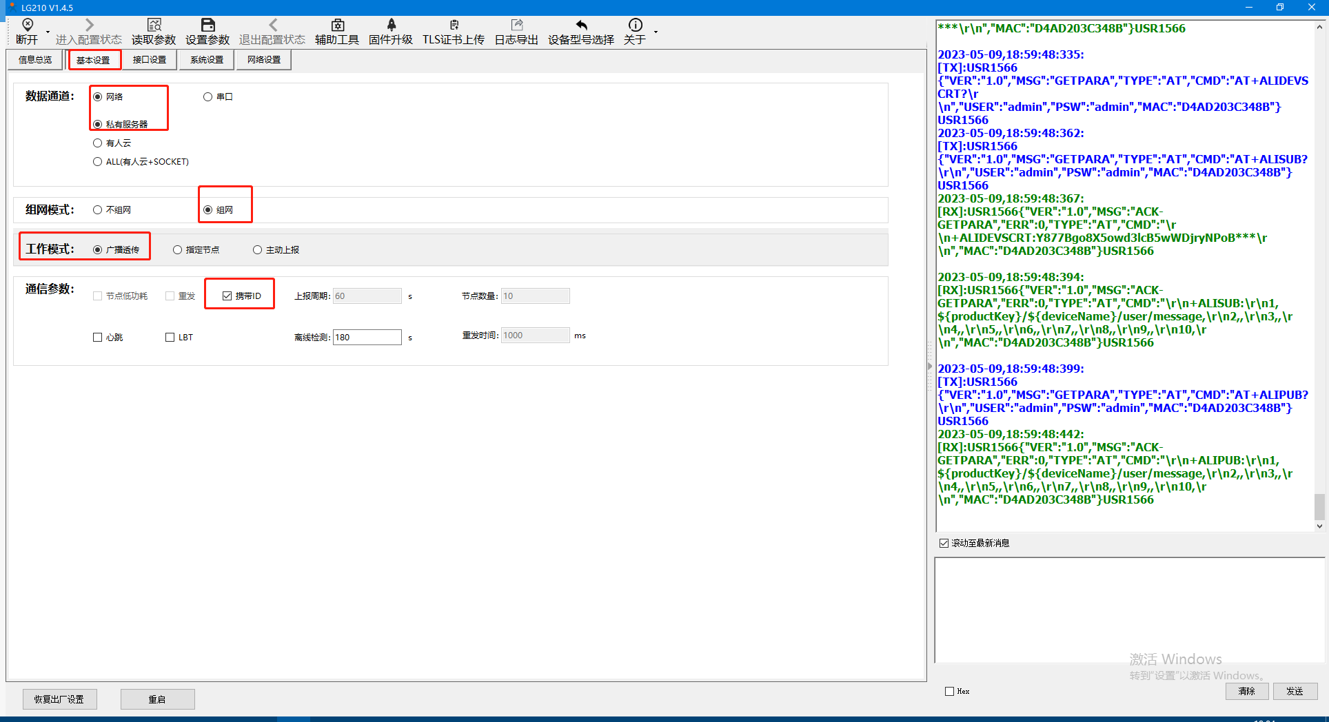 工作模式選擇“廣播透?jìng)鳌保?br />通信參數(shù)選擇“攜帶ID”;
