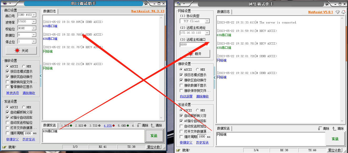 3、USB轉(zhuǎn)232的串口線接電腦,打開(kāi)一個(gè)串口調(diào)試助手模擬終端設(shè)備,可以看到串口和網(wǎng)絡(luò)端的數(shù)據(jù)正常通訊。