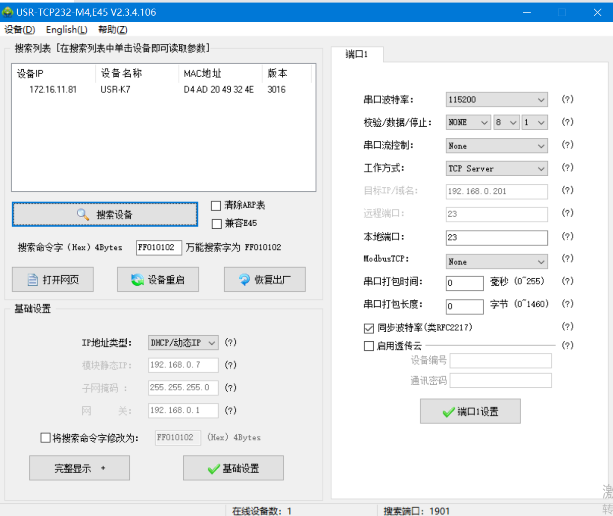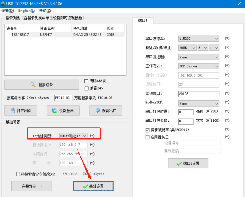 3. 打開(kāi)M4設(shè)置軟件,點(diǎn)擊搜索設(shè)備,可看到搜索到的設(shè)備,點(diǎn)擊選中,可看到IP地址類型為靜態(tài)IP