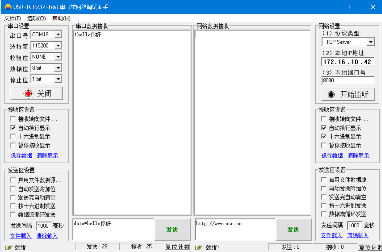7. 打開(kāi)串口,串口參數(shù)和K7的串口參數(shù)保持一致,發(fā)送data=hello你好,返回?cái)?shù)據(jù)hello你好