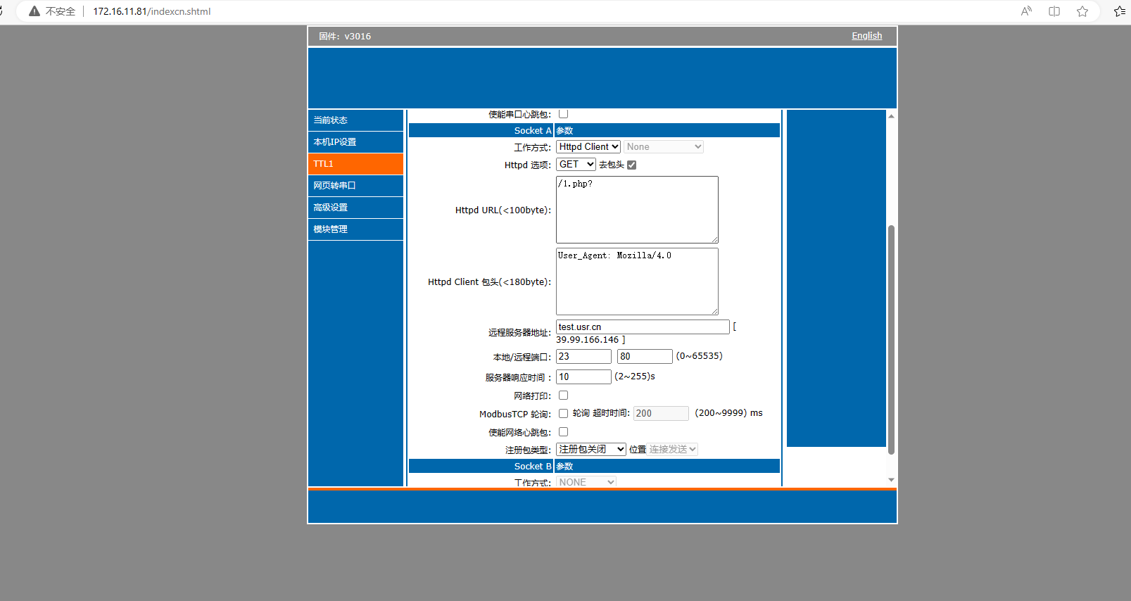 6. 在谷歌瀏覽器輸入IP 172.16.11.81,打開(kāi)k7內(nèi)置網(wǎng)頁(yè),用戶名密碼都為admin。模塊設(shè)置為Httpd Client模式,請(qǐng)求方式GET,URL為/1.php,設(shè)置服務(wù)器地址test.usr.cn,端口80,設(shè)置并保存所有參數(shù),重啟模塊。(本說(shuō)明文檔使用為有人測(cè)試服務(wù)器)
