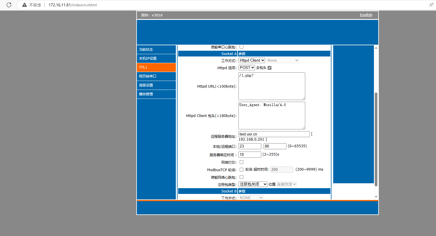 6. 在谷歌瀏覽器輸入IP 172.16.11.81,打開k7內(nèi)置網(wǎng)頁,用戶名密碼都為admin。模塊設置為Httpd Client模式,請求方式POST,URL為/2.php,設置服務器地址test.usr.cn,端口80,設置并保存所有參數(shù),重啟模塊。(本說明文檔使用為有人測試服務器)