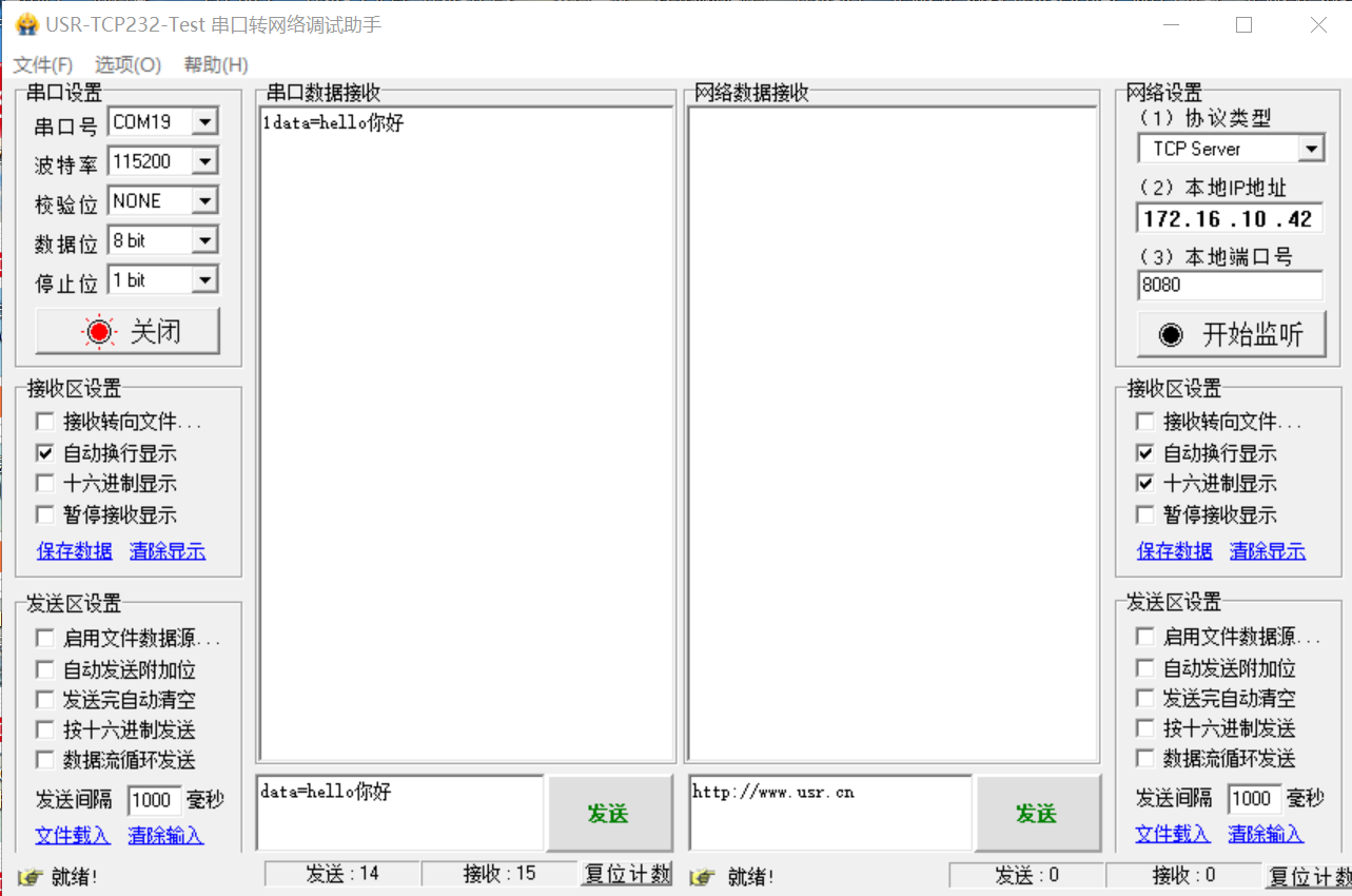 7. 打開串口,串口參數(shù)和K7的串口參數(shù)保持一致,發(fā)送data=hello你好,返回數(shù)據(jù):data=hello你好