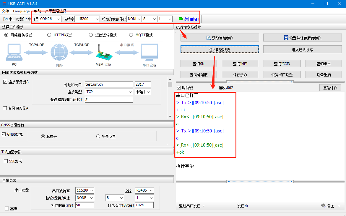 1.按照出廠默認的波特率(115200,N,8,1)打開電腦識別的COM口,點擊進入配置狀態(tài),獲取參數(shù)。