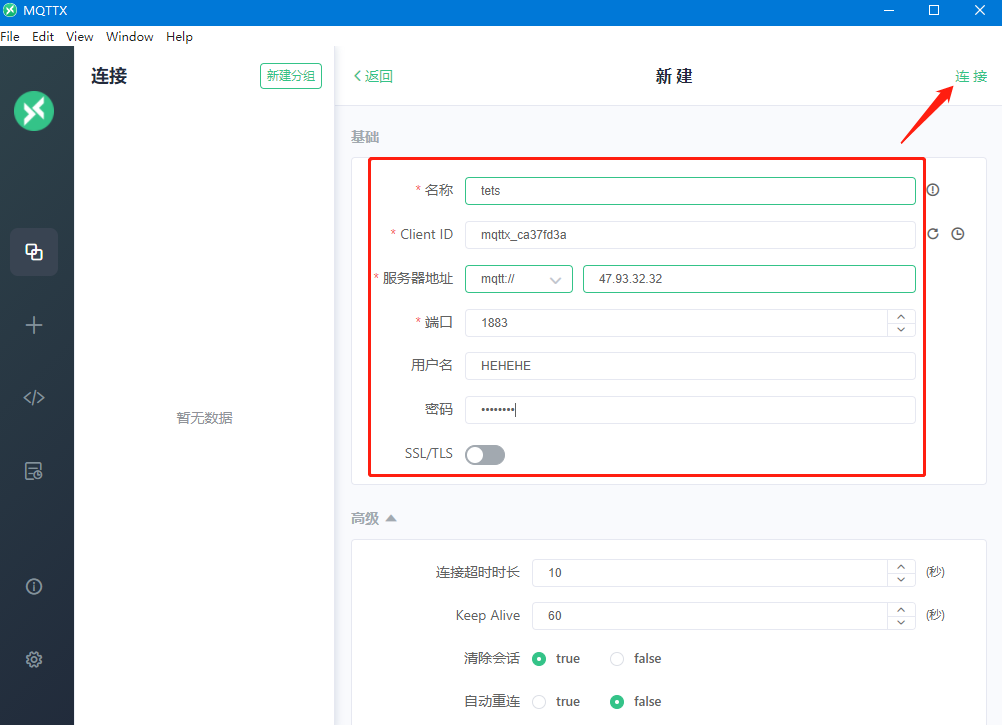 3.打開MQTT cleint軟件:MQTT.X,點擊新建一個客戶端,填寫好MQTT服務器參數(shù)后點擊"Connect”