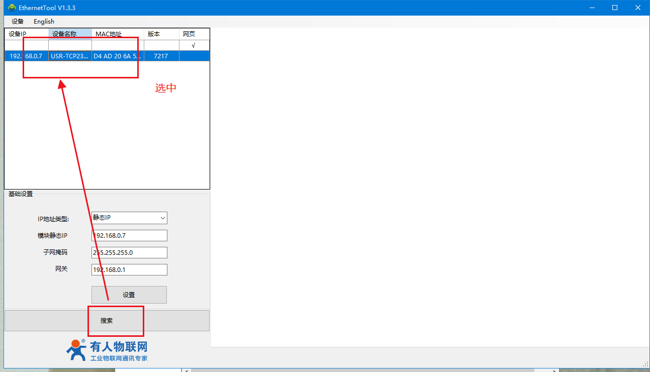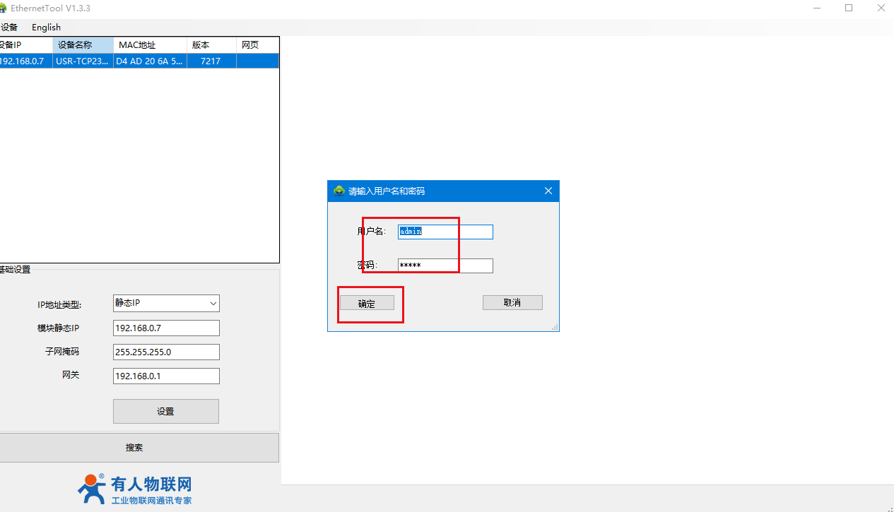 打開設(shè)置軟件,單擊搜索,找到設(shè)備之后,單擊產(chǎn)品名稱信息彈出輸入用戶名admin和密碼admin,點(diǎn)擊確定。在右上角點(diǎn)擊中英文切換。