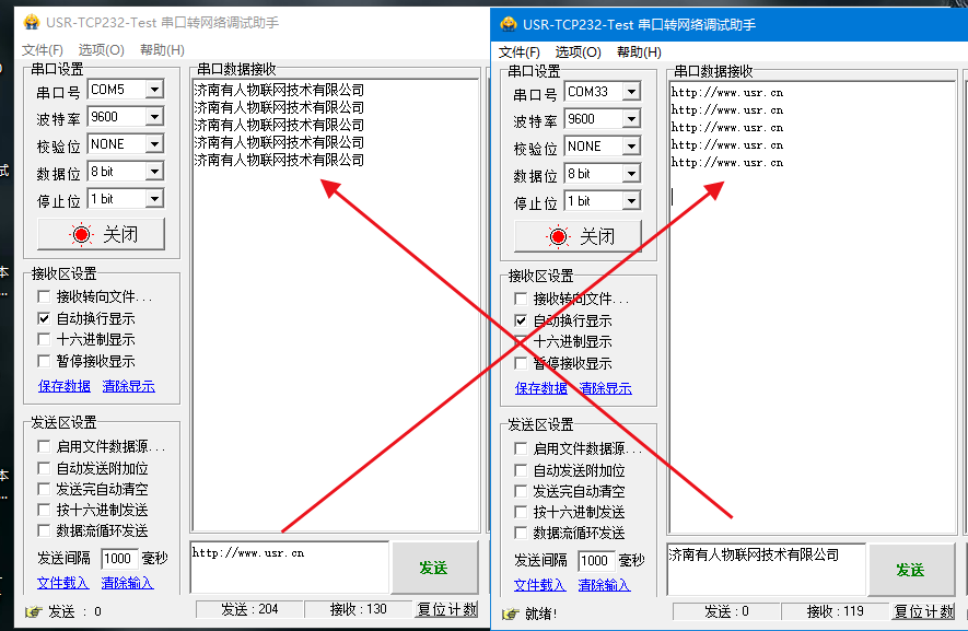 打開2個(gè)串口網(wǎng)絡(luò)助手,一個(gè)用USB-RS232 串口線實(shí)際COM33口打開,串口參數(shù)和RS232串口參數(shù)保持一致,波特率、數(shù)據(jù)位、停止位、校驗(yàn)位。