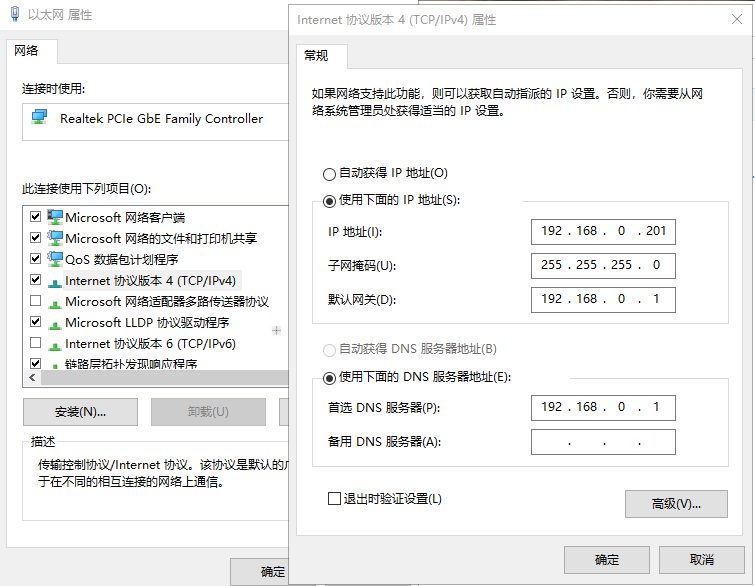 2.電腦本地連接,IP設(shè)置和E2模塊IP同網(wǎng)段,E2默認(rèn)IP是192.168.0.7,網(wǎng)關(guān)192.168.0.1,電腦本地連接IPv4設(shè)置靜態(tài)IP,192.168.0.201,子網(wǎng)掩碼255.255.255.0,網(wǎng)關(guān)192.168.0.1