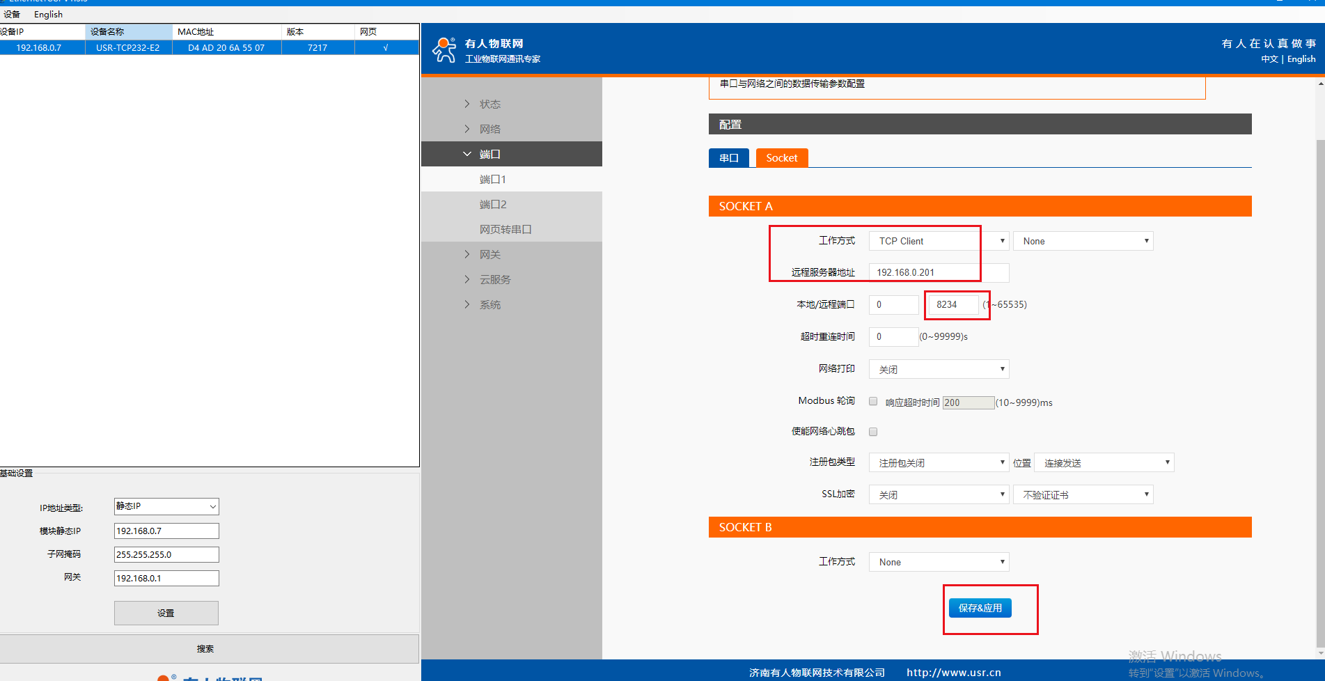 7.設(shè)置 E2 為 TCP client模式,連接虛擬串口的ip(電腦的ip),連接虛擬串口設(shè)置的本地端口:8234