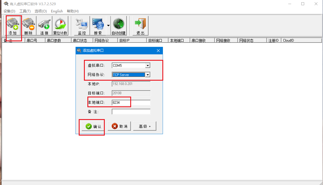 4.下載安裝虛擬串口軟件,打開,創(chuàng)建一個(gè)虛擬串口(注意不要和真實(shí)串口沖突)com5,網(wǎng)絡(luò)協(xié)議選擇tcp server,設(shè)置本地端口:8234 ,確認(rèn)