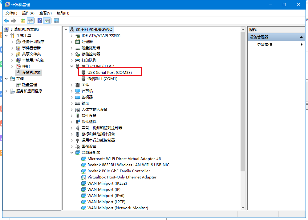 找到設(shè)備管理器,點(diǎn)擊端口,確認(rèn)USB-RS232串口線的COM口號(hào),有人的測(cè)試電腦是COM33