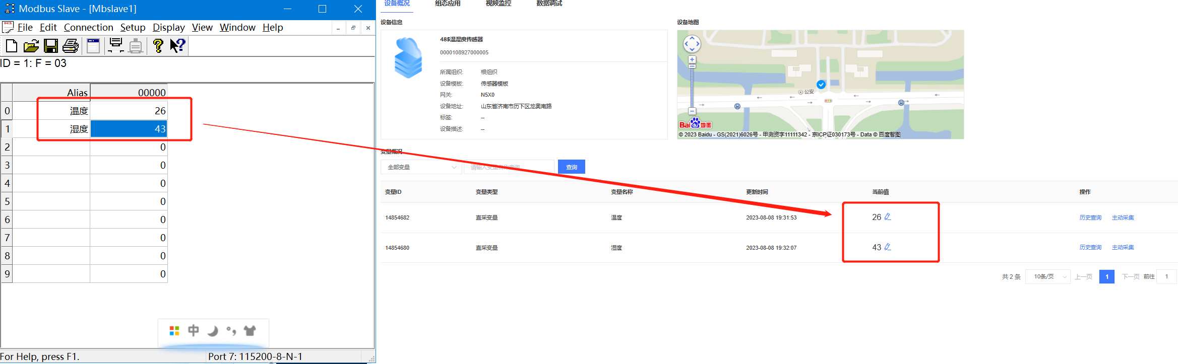 打開(kāi)modbus slave軟件(模擬串口傳感器設(shè)備)配置串口設(shè)備的寄存器信息,調(diào)用電腦設(shè)備管理器中生成的com口,并設(shè)置好寄存器參數(shù)。最終賦予slave值,會(huì)發(fā)現(xiàn)云端成功采集到slave從機(jī)數(shù)據(jù)。