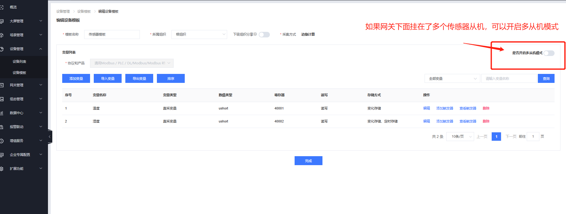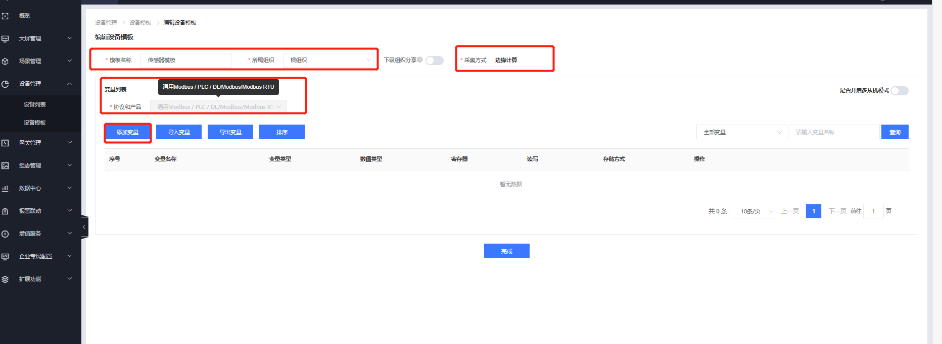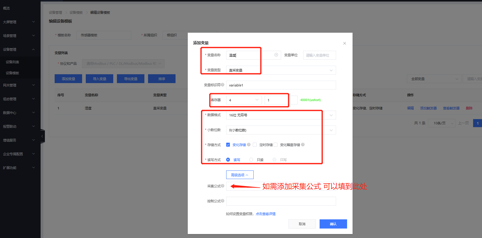 6、在設(shè)備管理---設(shè)備模板界面添加需要采集的從機(jī)變量點(diǎn)。寄存器信息需要與串口設(shè)備進(jìn)行匹配。