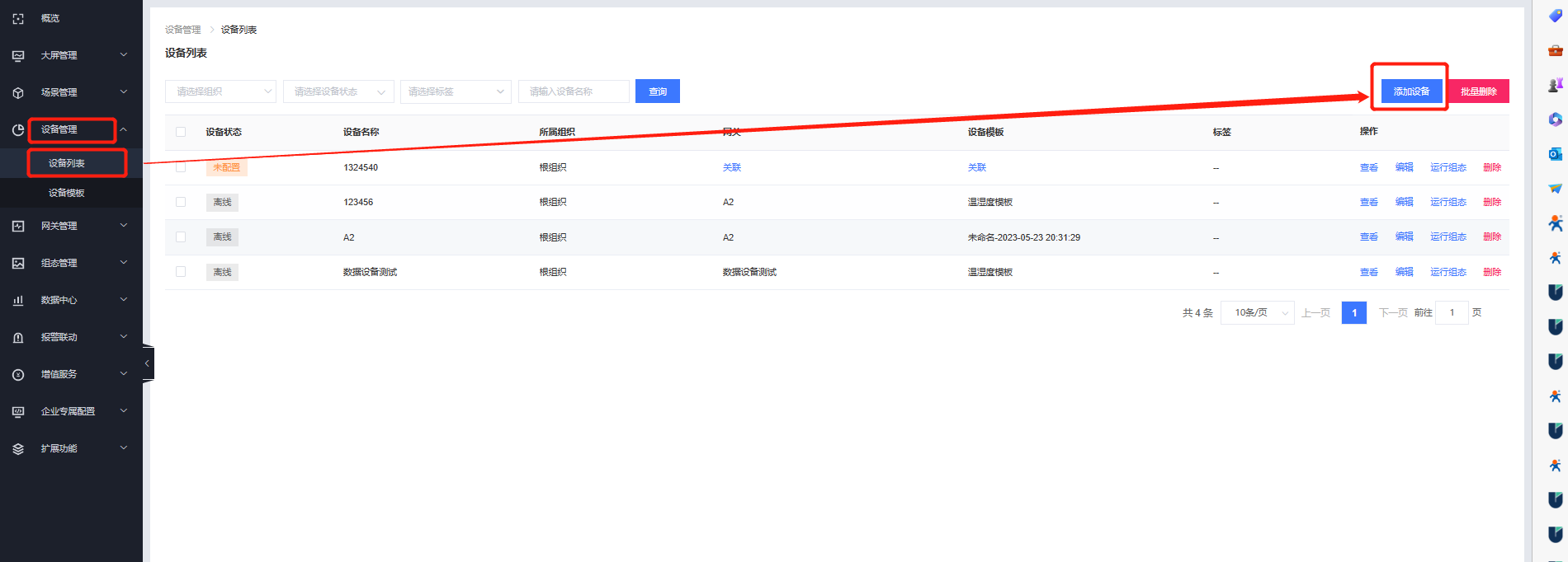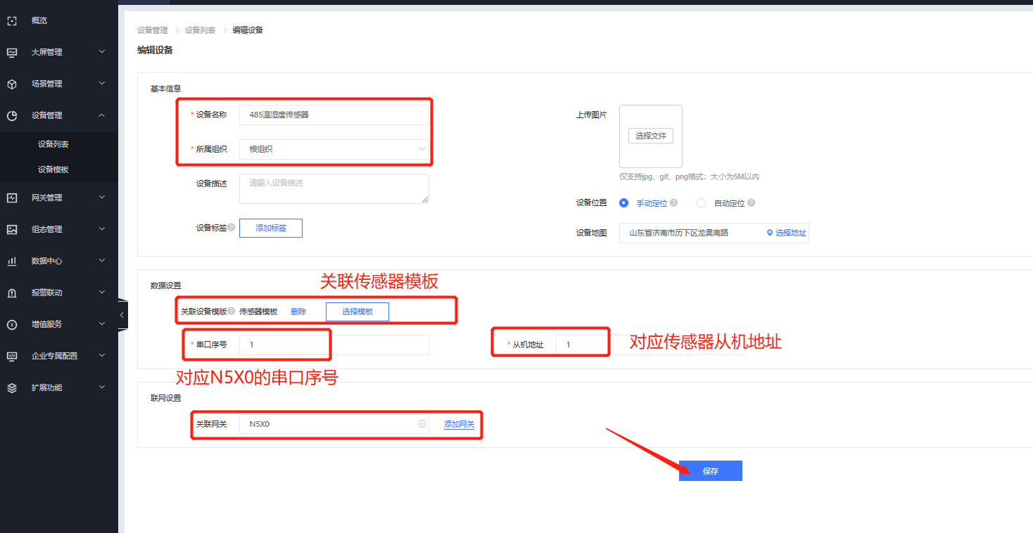7、在設(shè)備管理--設(shè)備列表的界面添加一個(gè)設(shè)備,把設(shè)備模板進(jìn)行關(guān)聯(lián),并配置串口終端設(shè)備的從機(jī)地址。