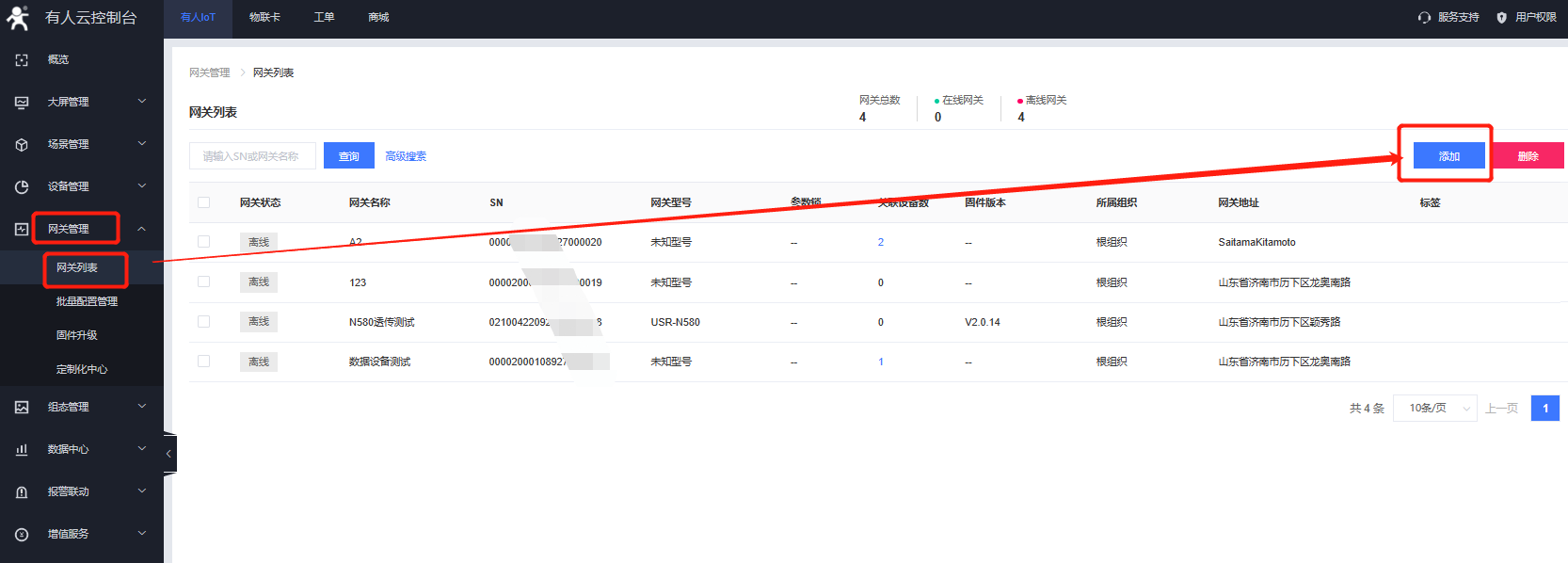 5、點(diǎn)擊網(wǎng)關(guān)管理----網(wǎng)關(guān)列表----添加網(wǎng)關(guān),選擇網(wǎng)關(guān)所屬組織,輸入N5X0的SN和MAC信息,點(diǎn)擊保存。