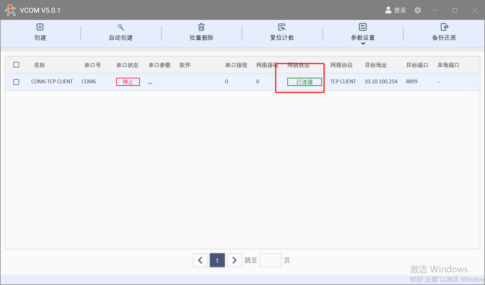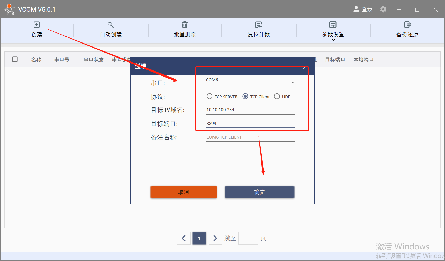 4.設(shè)置虛擬串口軟件為tcp client 目標(biāo)IP為10.10.100.254 目標(biāo)端口8899