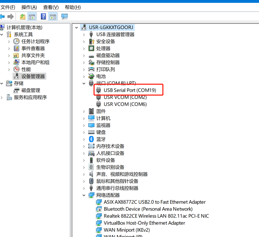 5.可以看到網(wǎng)絡(luò)狀態(tài)為已連接,在設(shè)備管理器找到232轉(zhuǎn)USB的端口號(hào)為com19