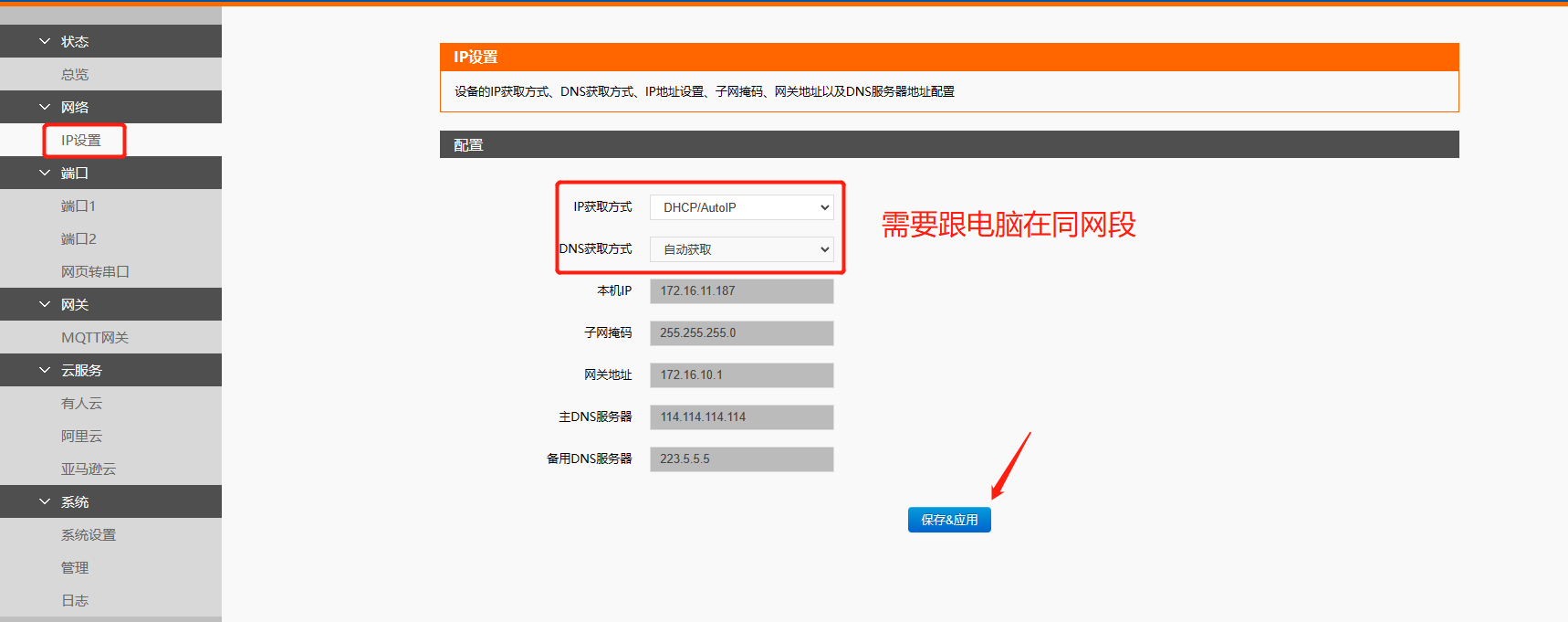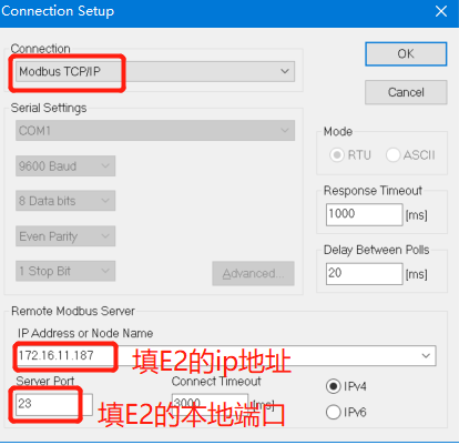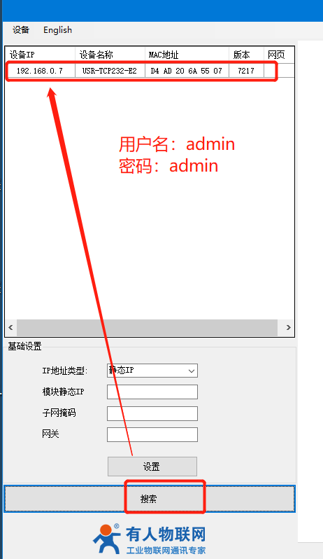 點擊“搜索設(shè)備”當(dāng)搜索列表中出現(xiàn)E2的設(shè)備后,單擊搜索到的設(shè)備,查看其配置信息,設(shè)置模塊的ip需要跟電腦在同網(wǎng)段。(這邊是電腦跟E2模塊接了同一個路由器,所以選擇E2模塊DHCP動態(tài)獲取ip)