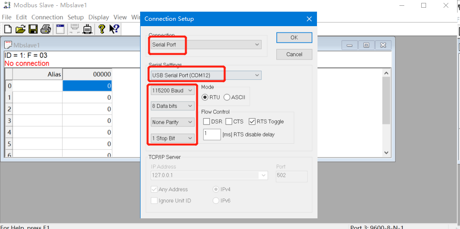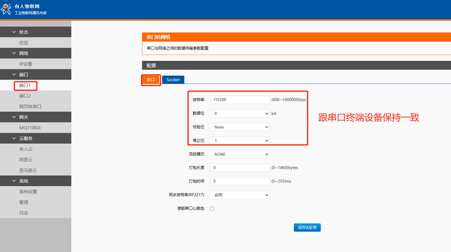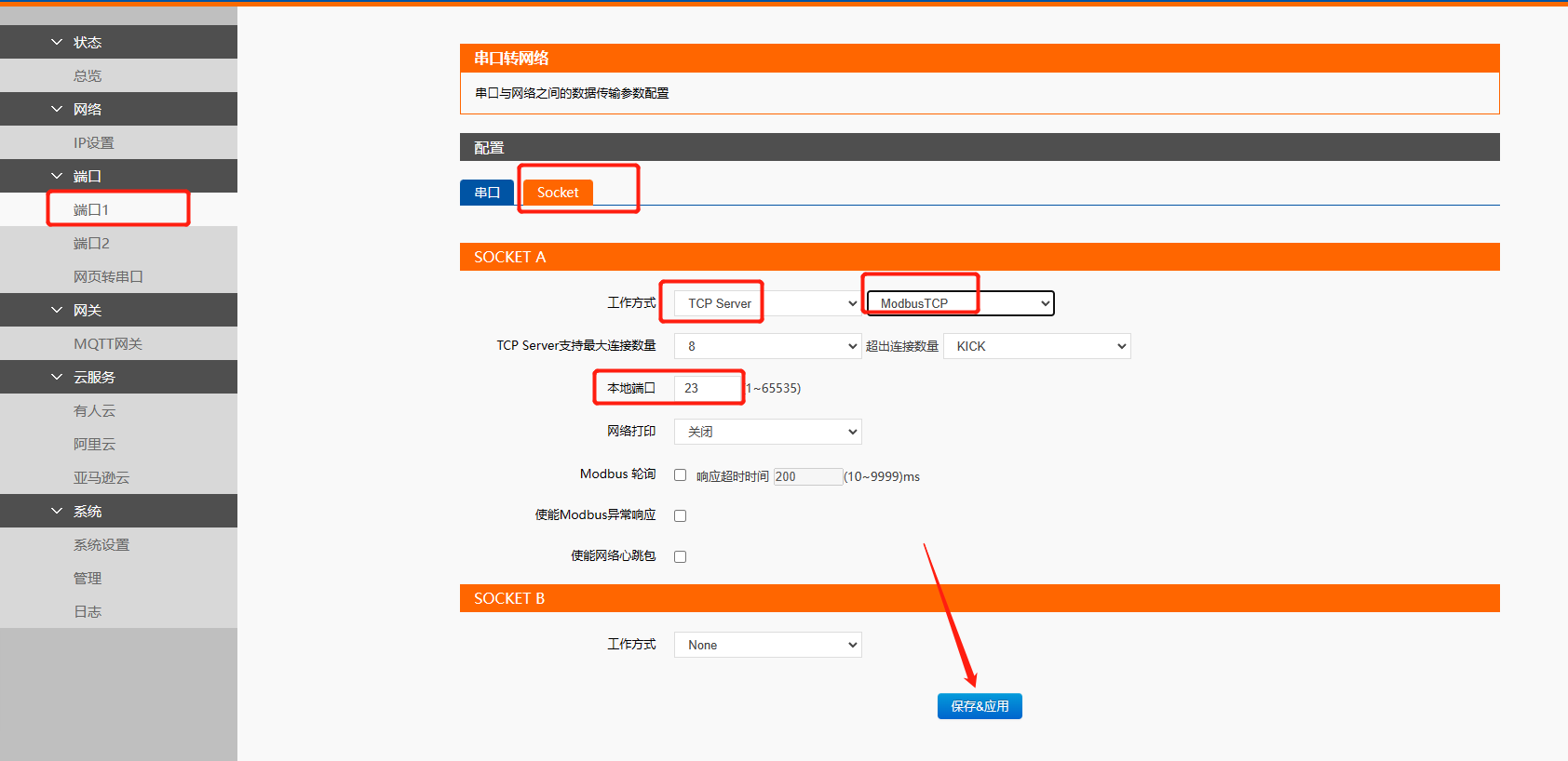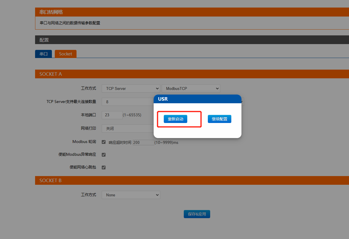 3、設(shè)置串口參數(shù)跟終端設(shè)備保持一致。Socket工作方式選擇Tcp server,本地端口23,并開啟modbus tcp使能,最后需要保存參數(shù),重啟模塊。