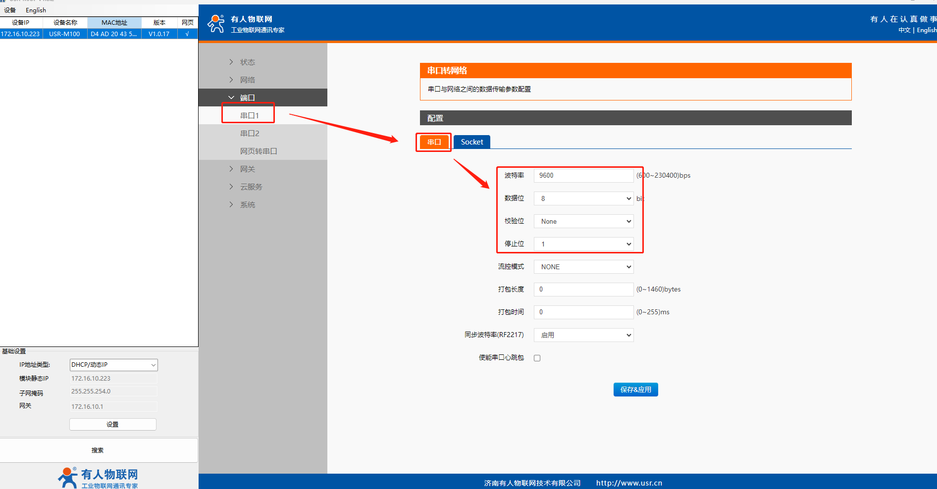 (7)“端口‘>”串口1’>“串口”界面中配置M100的串口參數(shù),將參數(shù)修改為“9600 8 NONE 1 NONE"點擊“保存&應(yīng)用”-“繼續(xù)配置”.