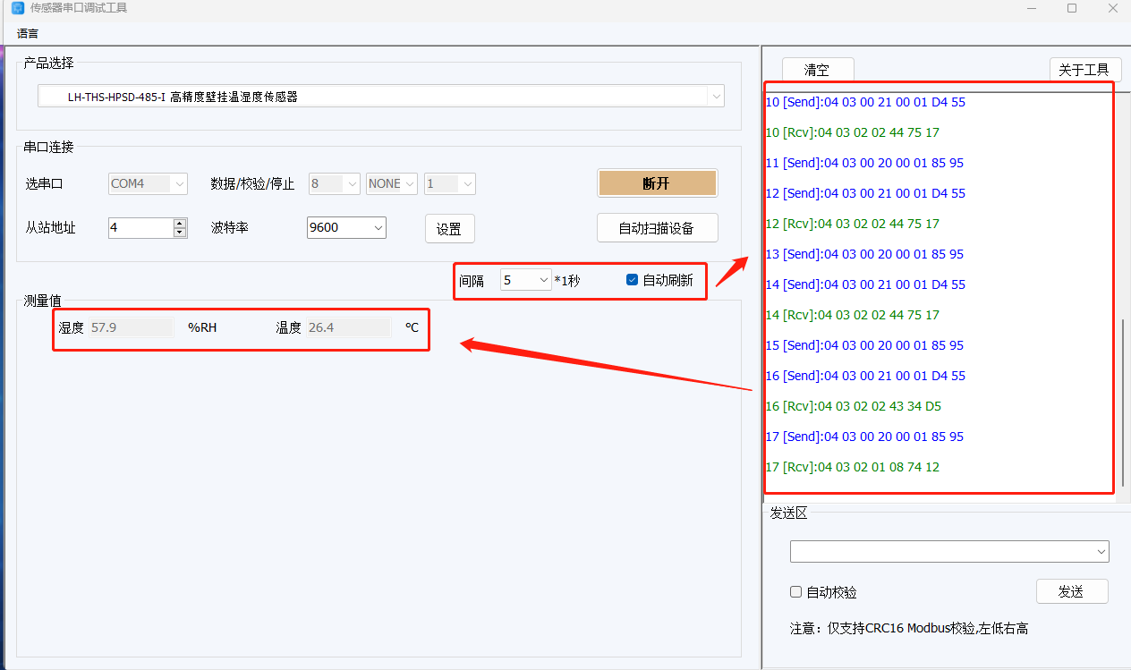 (4)點擊確定,選擇輪詢間隔,勾選自動刷新,軟件即會按照設(shè)定好的時間間隔去輪詢傳感器數(shù)據(jù)。傳感器獲取到溫濕度數(shù)據(jù),確認(rèn)傳感器正常工作,接入到M100的485端口即可。