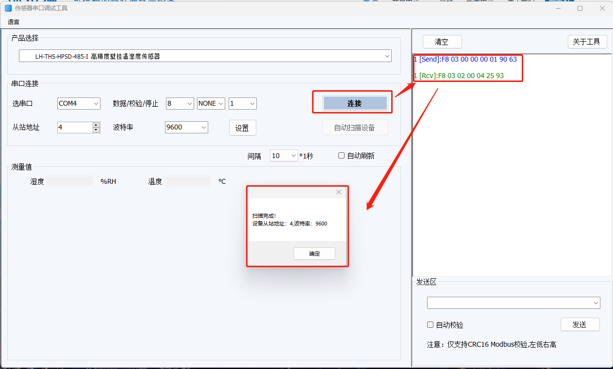 (3)點擊自動掃描,軟件會用廣播地址去尋址設(shè)備,并彈出提示框,提示傳感器設(shè)備地址和波特率參數(shù)。