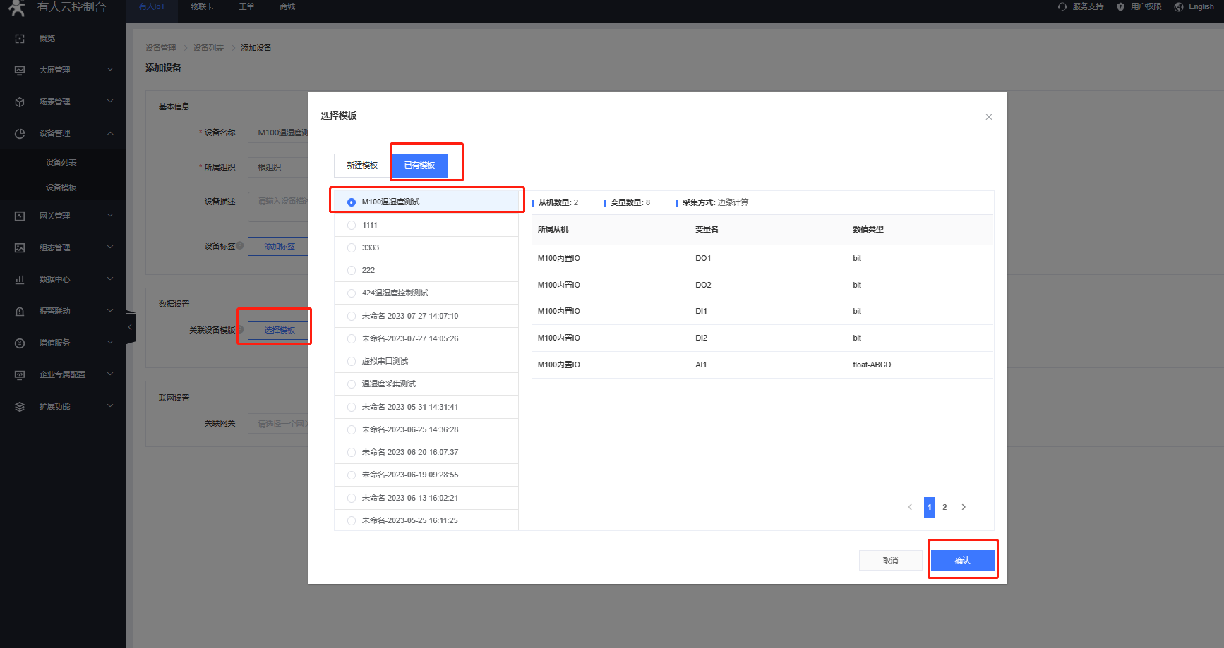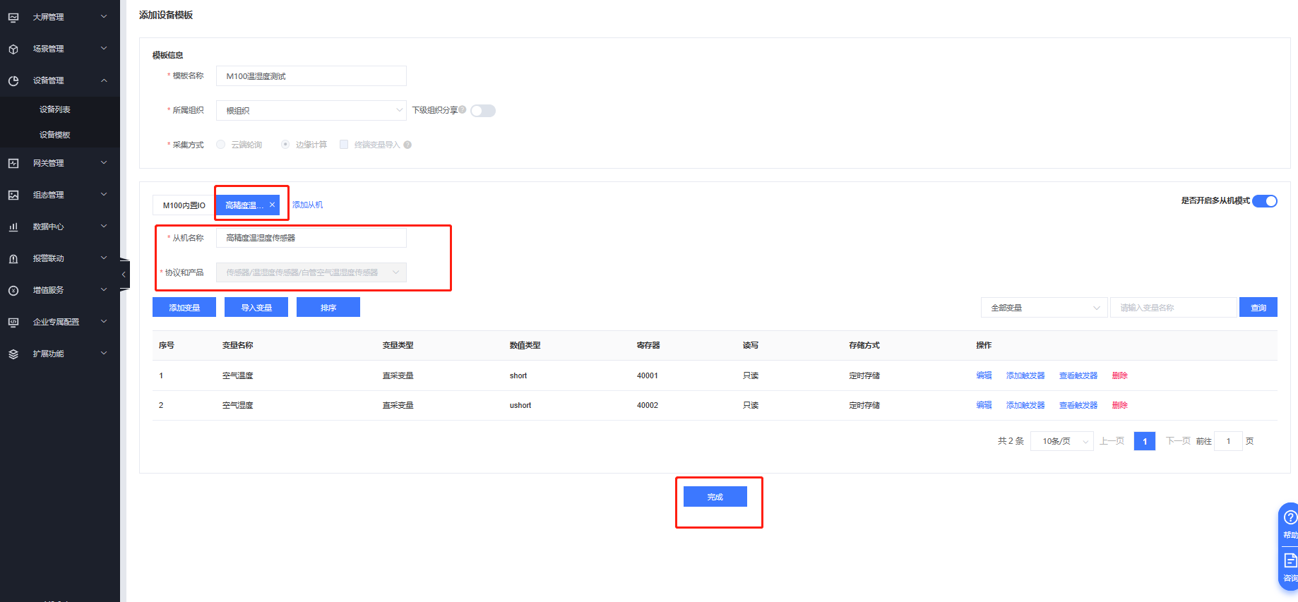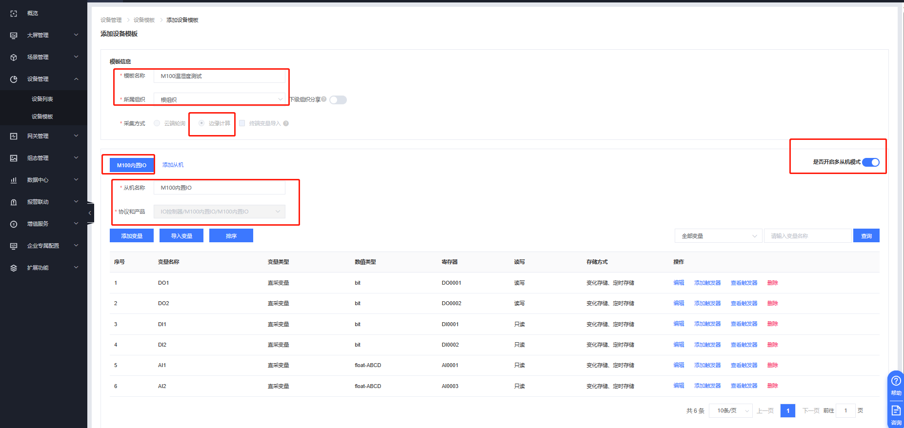設(shè)備管理--設(shè)備模板---添加---模板名稱為:M100溫濕度測試--根組織---邊緣計算--開啟多從機(jī)模式,先添加M100的內(nèi)置IO