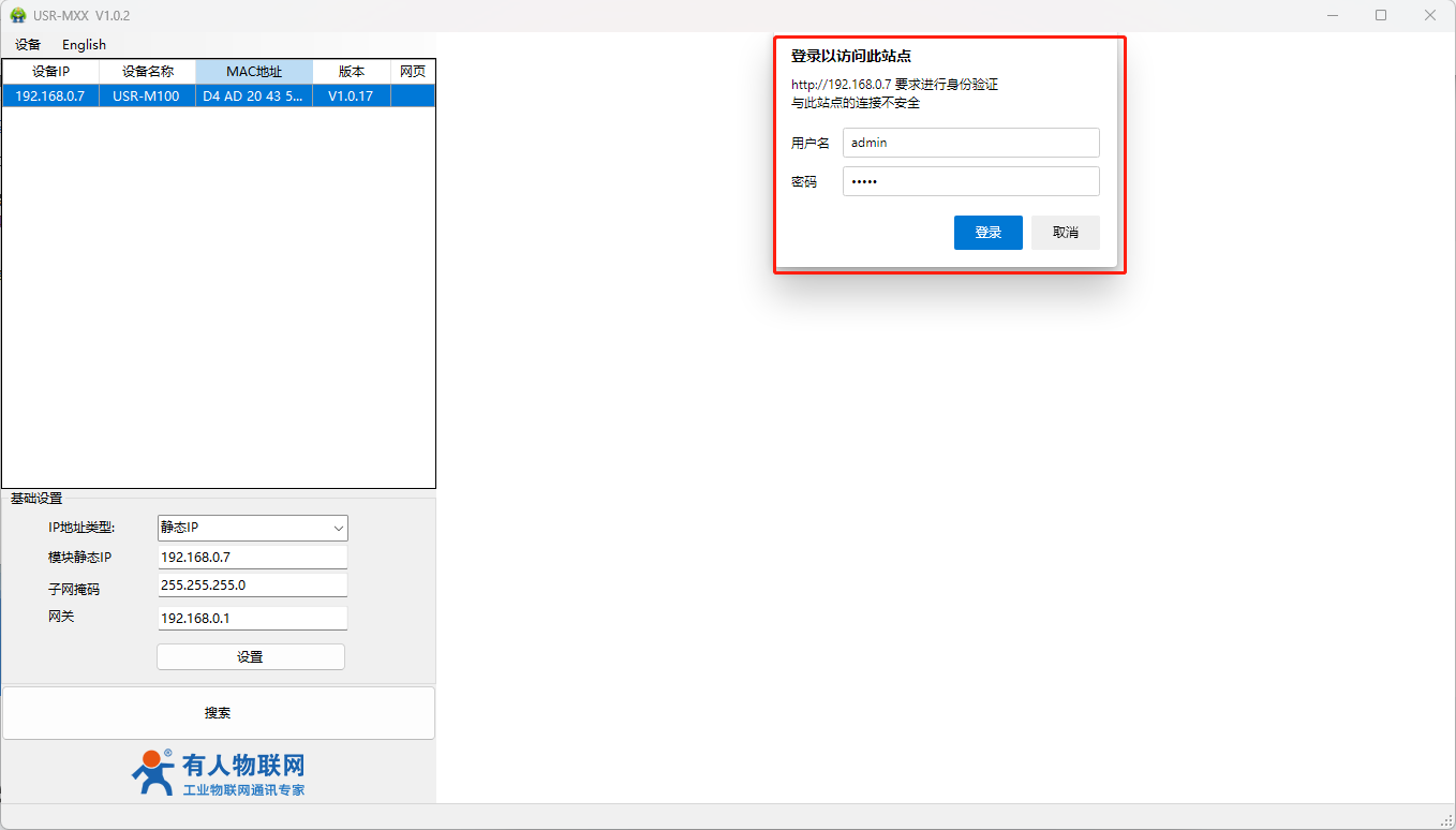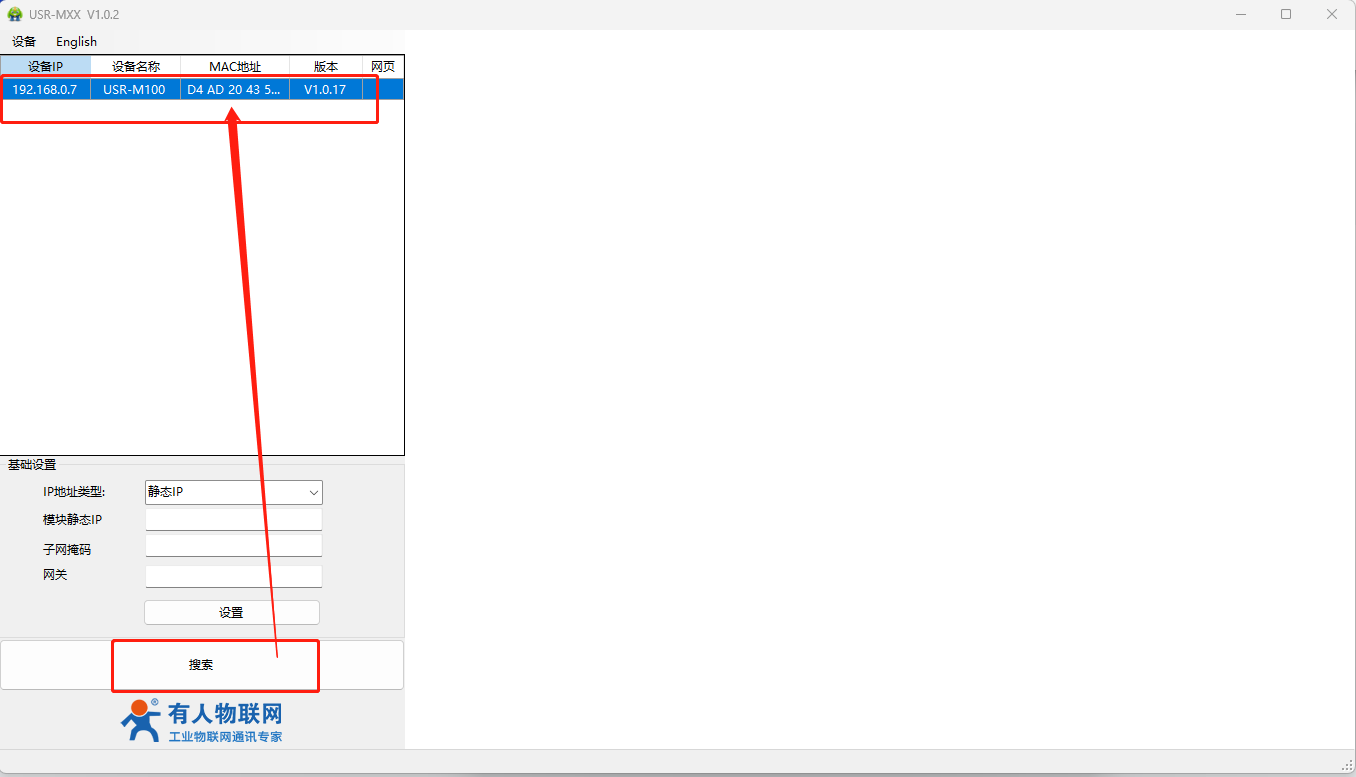(4)下載并打開系列設(shè)置軟件:用配置軟件搜索M100設(shè)備,單擊搜索,搜搜到設(shè)備后雙擊設(shè)備。