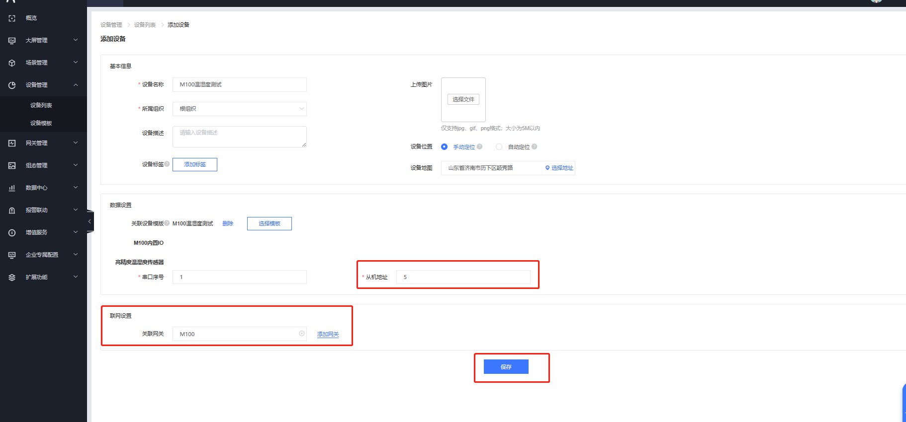 上面測試過程中,溫濕度傳感器的地址設(shè)置為5,所以這里填寫5,然后聯(lián)網(wǎng)設(shè)置中關(guān)聯(lián)網(wǎng)關(guān)M100,點擊保存