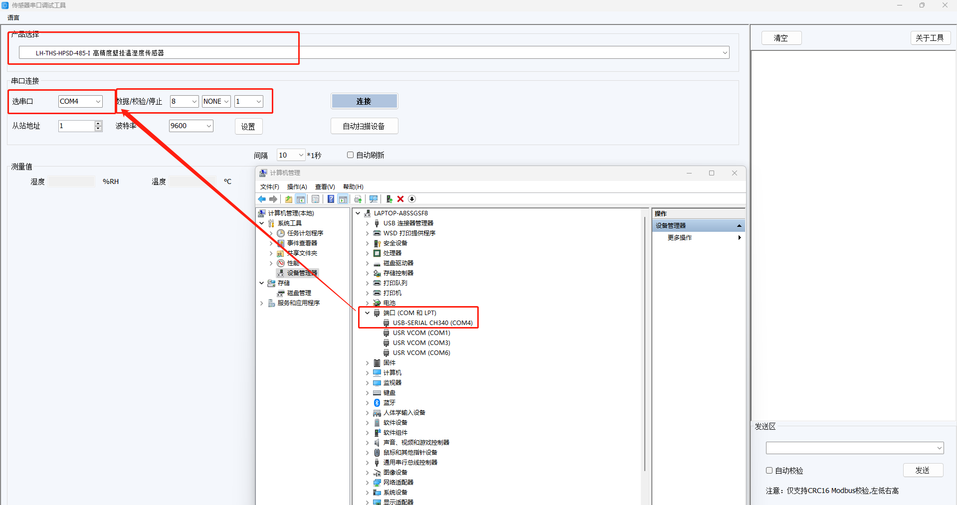 (1)使用USB轉(zhuǎn)485轉(zhuǎn)換器將LH-THSD-485-I接到電腦上,注意線序顏色不要接反,電腦打開控制面板--設(shè)備管理器--COM和LPT,確認(rèn)轉(zhuǎn)換器驅(qū)動是否正常以及轉(zhuǎn)換器的COM端口號。