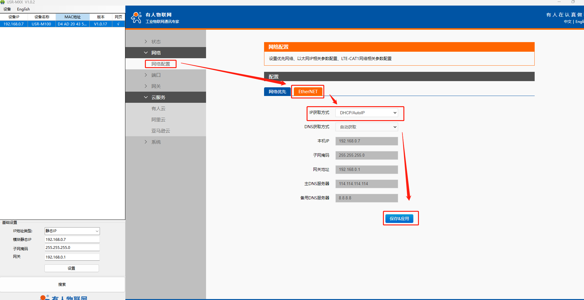(8)在“網(wǎng)絡(luò)”>“網(wǎng)絡(luò)配置”>“EtherNET”界面中配置本機(jī)DHCP自動獲取IP或者設(shè)置靜態(tài)IP, 本案例配置為DHCP自動獲取IP,若需要配置M100靜態(tài)IP上網(wǎng)的話可以自行設(shè)置靜態(tài)ip(Static IP)。
