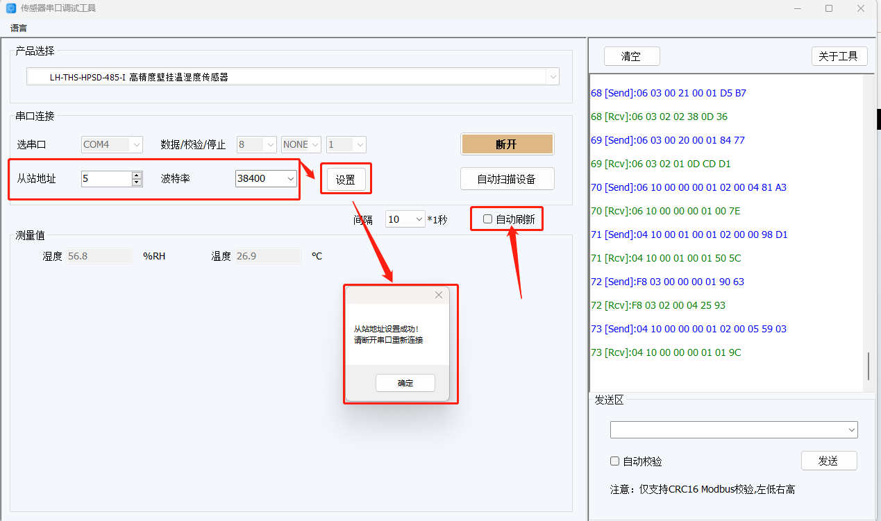 如需要修改傳感器參數(shù):先將自動刷新勾掉,填入目標(biāo)從站地址和波特率,然后點擊設(shè)置,修改成功會彈出提示信息,修改后再將其接入到M100的串口上