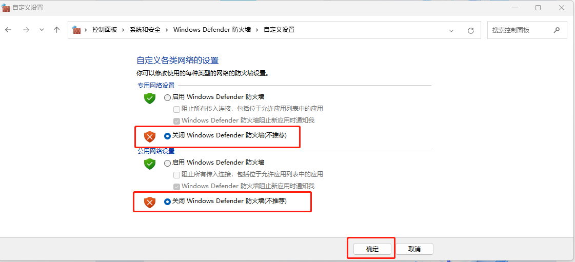 (2)電腦關(guān)閉防火墻和殺毒軟件:控制面板--系統(tǒng)和安全--Windows Defender 防火墻--關(guān)閉防火墻