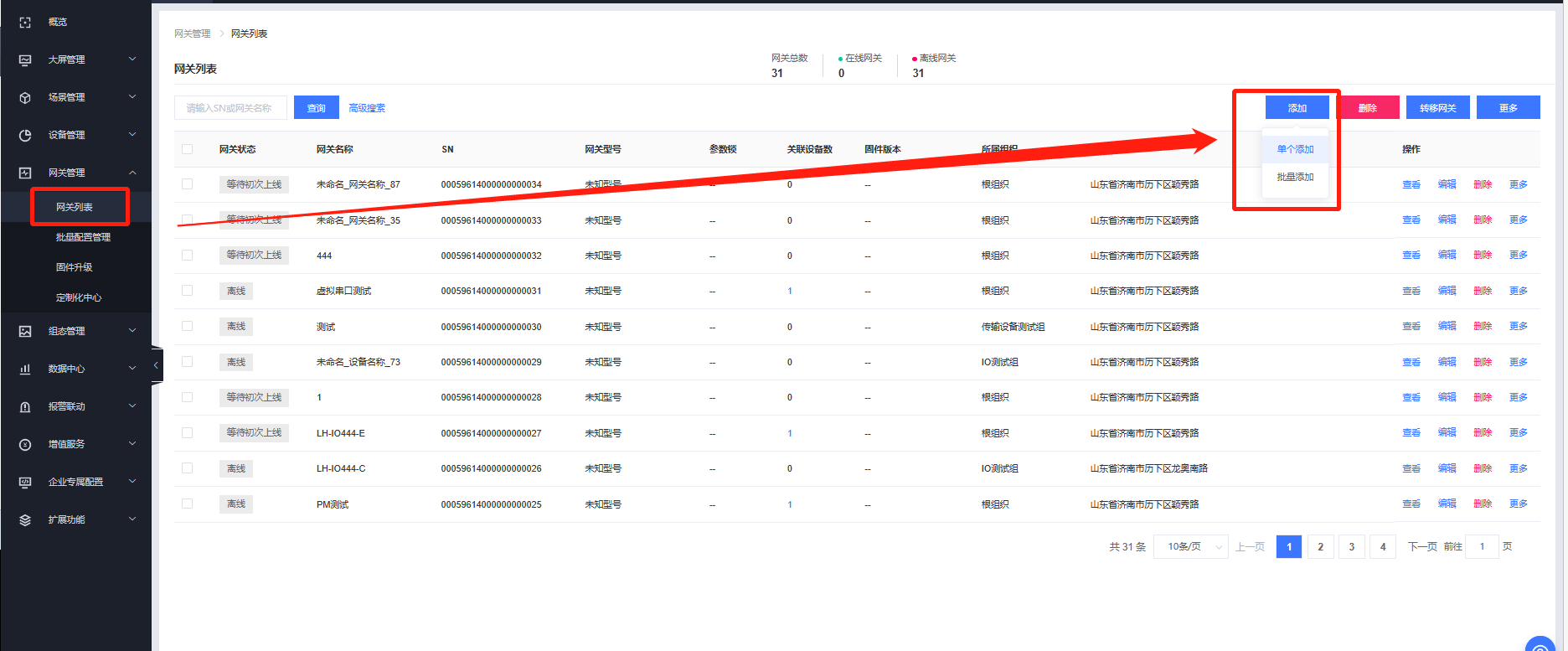 (2)點擊網(wǎng)關(guān)管理--網(wǎng)關(guān)列表--添加--單個添加(若有多個同型號設(shè)備,可以選擇批量添加)---將M100側(cè)面的二維碼掃描添加即可