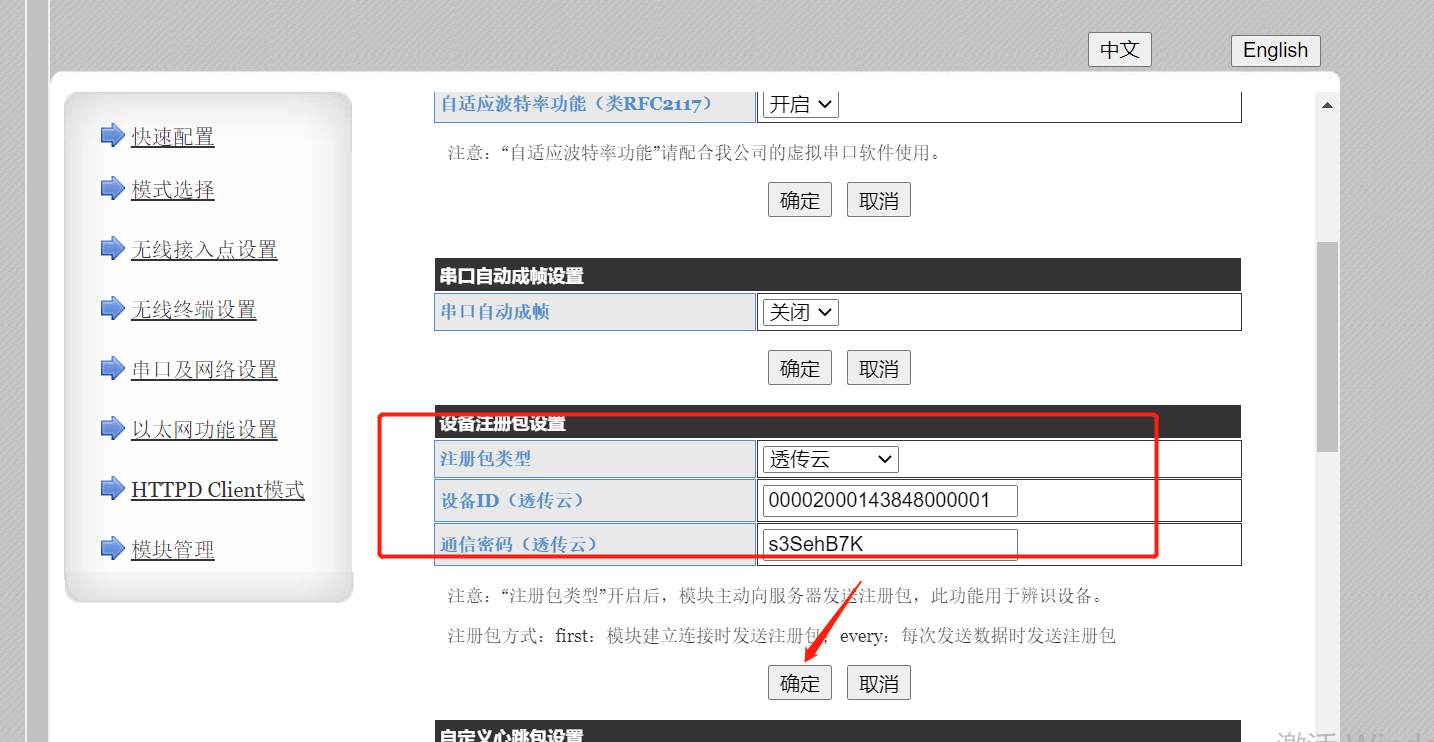 (2)注冊包選擇透傳云,填上透傳云上新建立的設(shè)備id,和密碼(如下圖所示),點擊保存。