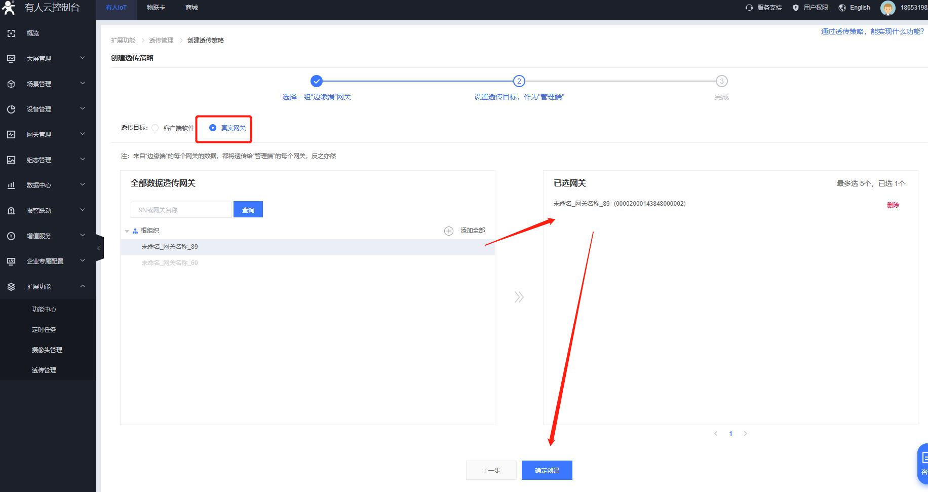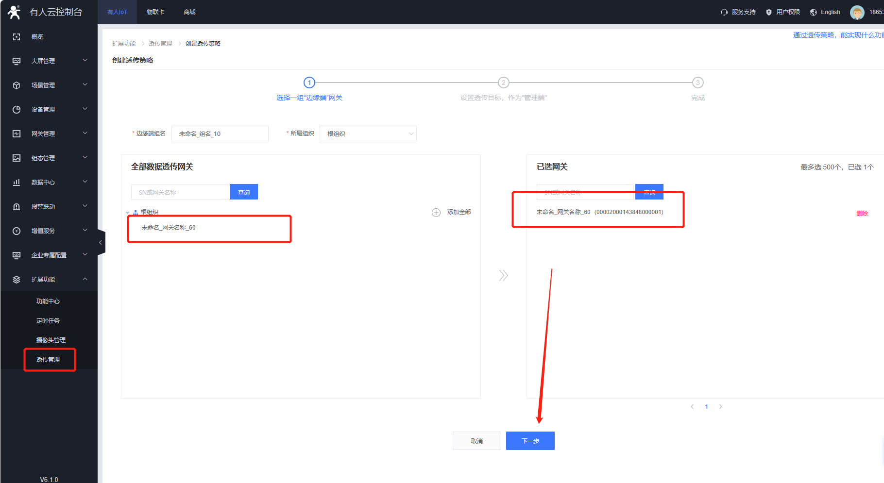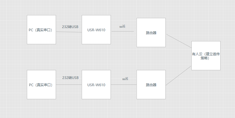 參考以上步驟用同樣的方式再添加另一個(gè)w610在有人云在線(同樣需要打開有人云透傳開關(guān)),并在云端建立透傳策略,如下: