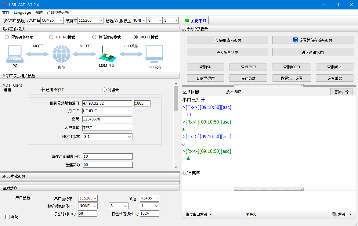 1.按照出廠默認(rèn)的波特率(115200,N,8,1)打開電腦識別的COM口,點(diǎn)擊進(jìn)入配置狀態(tài),獲取參數(shù)。